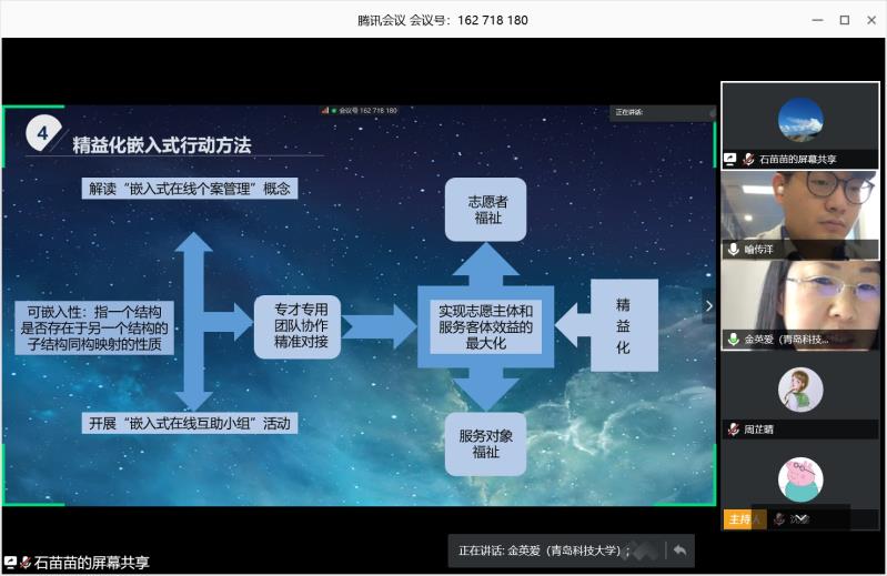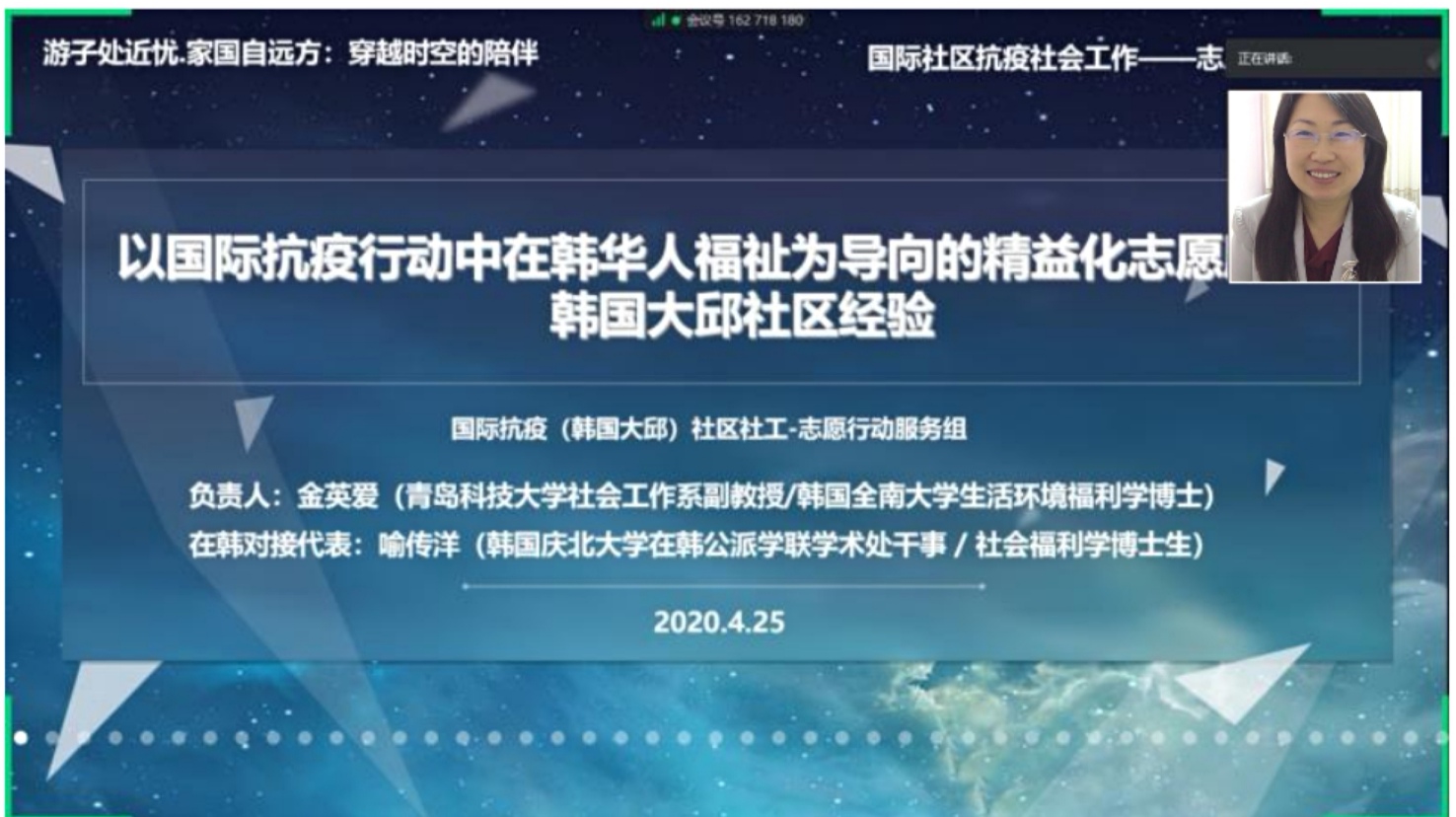 中韩国际社区抗疫行动负责人、中国·太阳集团tyc9728社会工作系金英爱副教授,与在韩对接人代表、韩国庆北大学在韩公派学联学术处干事喻传洋博士生,以《以国际抗疫行动中在韩华人福祉为导向的精益化志愿服务:韩国大邱社区经验》为主题,进行了一场“隔空对接式”联合发言。两位代表的发言以时间为线索,以数据为证据,详细描述了自今年2月底以来,行动组秉承“奉献、友爱、互助、进步“的志愿精神,通过精益化嵌入式的社会工作专业方法,为韩国疫情最严重的大邱广域市中国留学生和多文化家庭等2300多名华人群体提供在线公益服务的实务经验和研究成果。