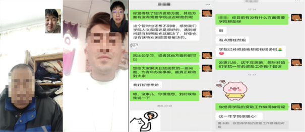 小张和父亲专门抽出时间参加了此次线上走访。小张父亲虽不善言辞,但话语间流露出激动之情,多次感谢国家、学校和学院对于孩子的资助和关怀,反复说道把孩子交给老师非常放心;山东籍脱贫享受政策家庭学生小静(化名)近期收到了学校下发的暖冬补贴,她通过视频连线向学校表达了感激之情,并表示一定努力学习,不辜负学校和学院对自己的帮助,将来回报社会,把爱心传递下去。