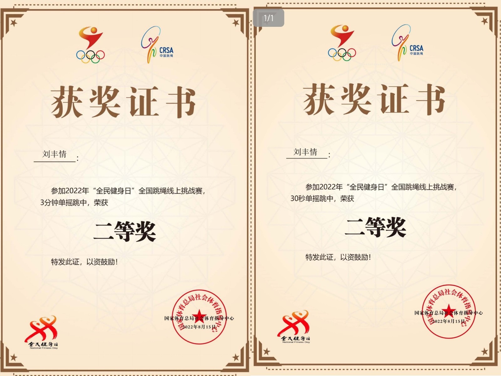 近日,正值2022年“全民健身日”之际,由国家体育总局社会体育指导中心、群体体育司等部门主办的多项体育赛事如期举办。太阳成集团tyc97282021级学生刘丰情在全国跳绳线上挑战赛、全民健身线上运动会等比赛中斩获多项大奖。