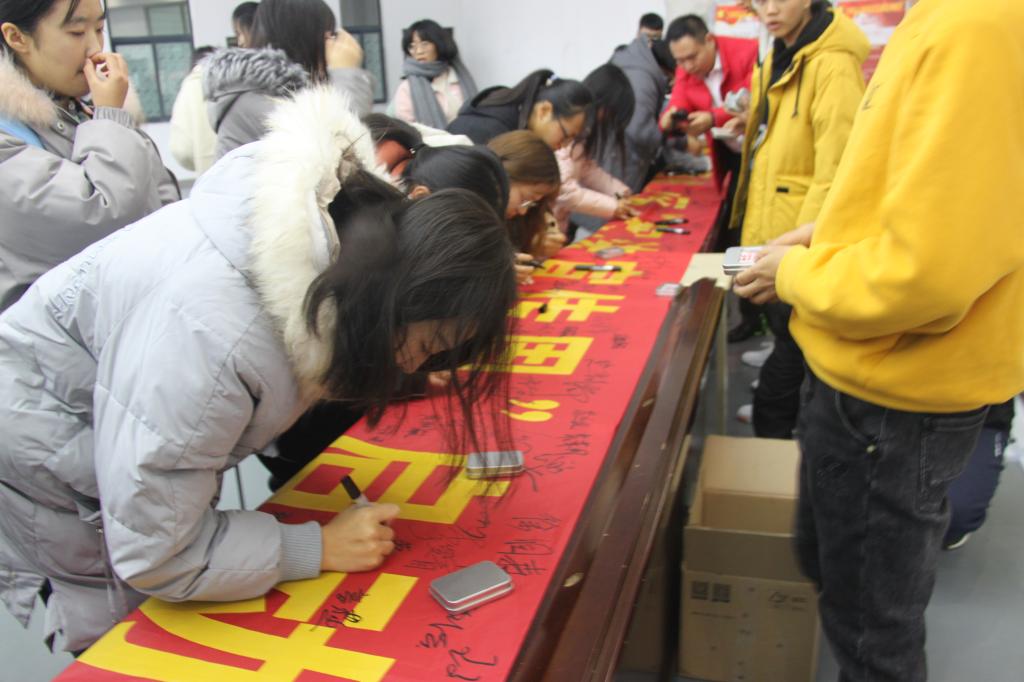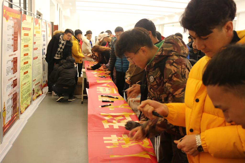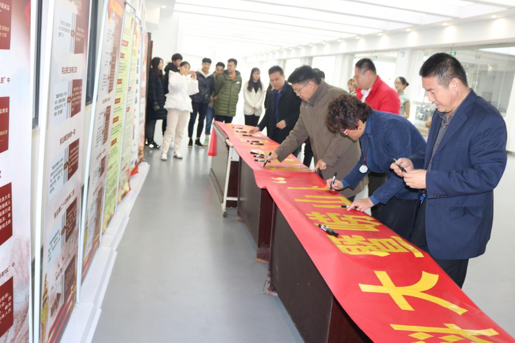 与会领导及师生在“宪法宣传周”横幅上签名并合影留念。