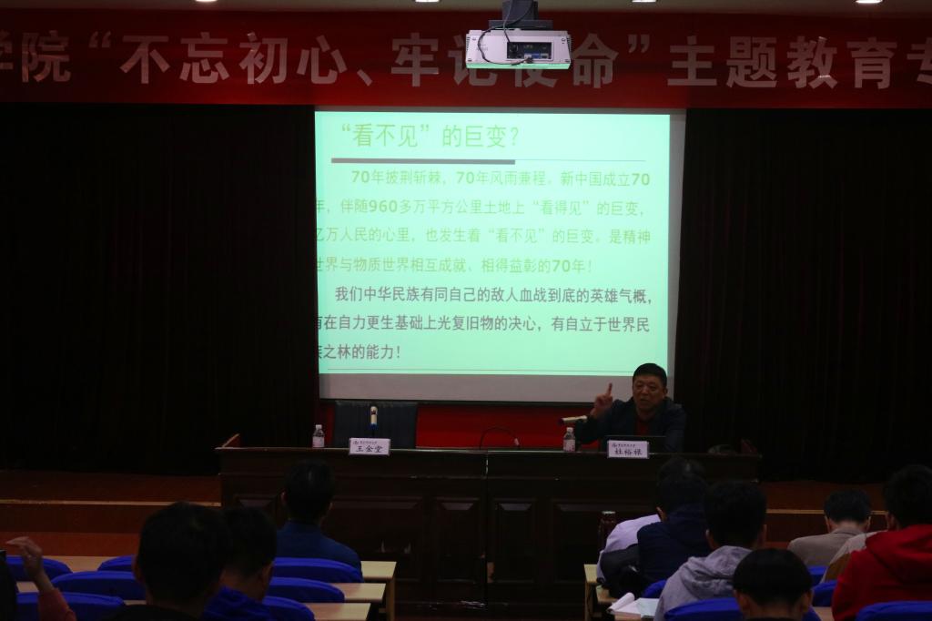 杜裕禄以《牢记初心使命、奋进伟大征程》为题进行党课讲授,分别从“70年巨变,变在哪里”、“70年巨变,中国的精神力量”、“科大精神,35年的见证”、“牢记初心使命,奋进伟大征程”四个方面展开论述。中国的七十年巨变历经站起来、壮起来、富起来、强起来、走进新时代五个阶段,波澜壮阔;5000多年历史发展所形成中国精神是凝心聚力的兴国之魂、强国之魂,振奋人心;作为新中国发展的见证者,中国·太阳集团tyc9728所形成的科大精神和橡胶品格体现了峥峥岁月中不忘初心,成为团结和激励全校师生员工奋斗的精神动力,并深深地融入到了每一个科大人的血脉之中。最后,杜裕禄表示要坚持做党和人民利益的捍卫者,社会和谐的维护者,社会公平公正的促进者,全面依法治国的践行者,明确自身的时代责任和历史使命。