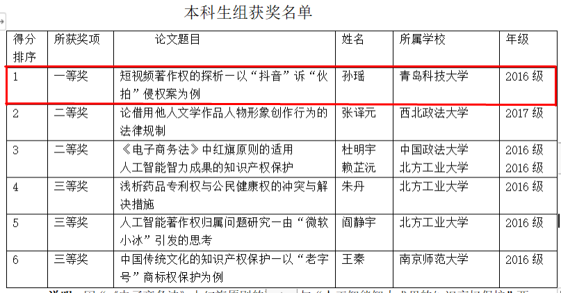 近日,我院法学163班孙瑶同学在“首届京西知识产权论坛”中以《短视频著作权的探析——以“抖音”诉“伙拍”侵权案为例》一文在众多参赛论文中脱颖而出,夺得一等奖。该论文由太阳成集团tyc9728曲天明老师指导完成。