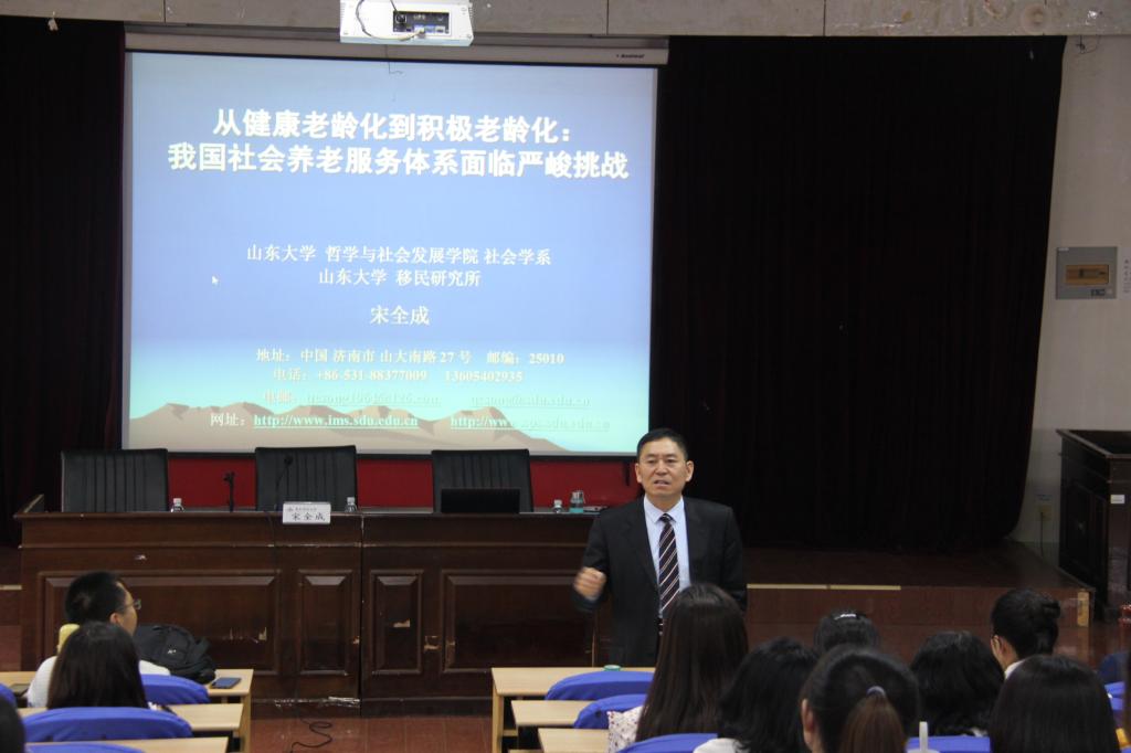 聘任仪式结束后,宋全成教授为参会的社会工作专业全体师生做了一场题为《从健康老龄化到积极老龄化:我国社会养老服务体系面临严峻挑战》的学术讲座。宋全成教授从中国老龄化背景、理论和趋势讲起,着重从健康老龄化到积极老龄化角度、围绕决定积极老龄化政策的三个关键要素--收入、工作、社会保护以及积极老龄化框架的三个支柱---健康、参与与保障,分析了我国社会养老服务体系建设的现状及存在问题及难点、发达国家社会养老服务的成功经验、我国社会养老服务的发展前景等。宋教授以诙谐的语言,深入浅出,借助于数字、图表等直观方式进行深度探究,激起了大家的热情与兴趣,学生和老师最后与宋教授进行了积极互动,让大家受益颇丰。