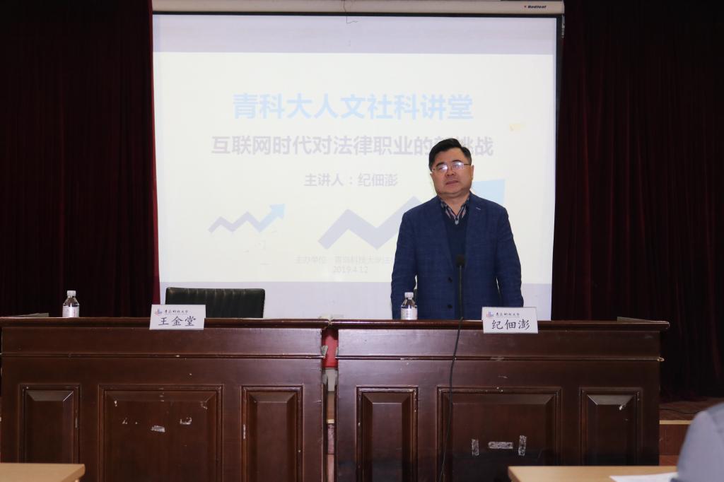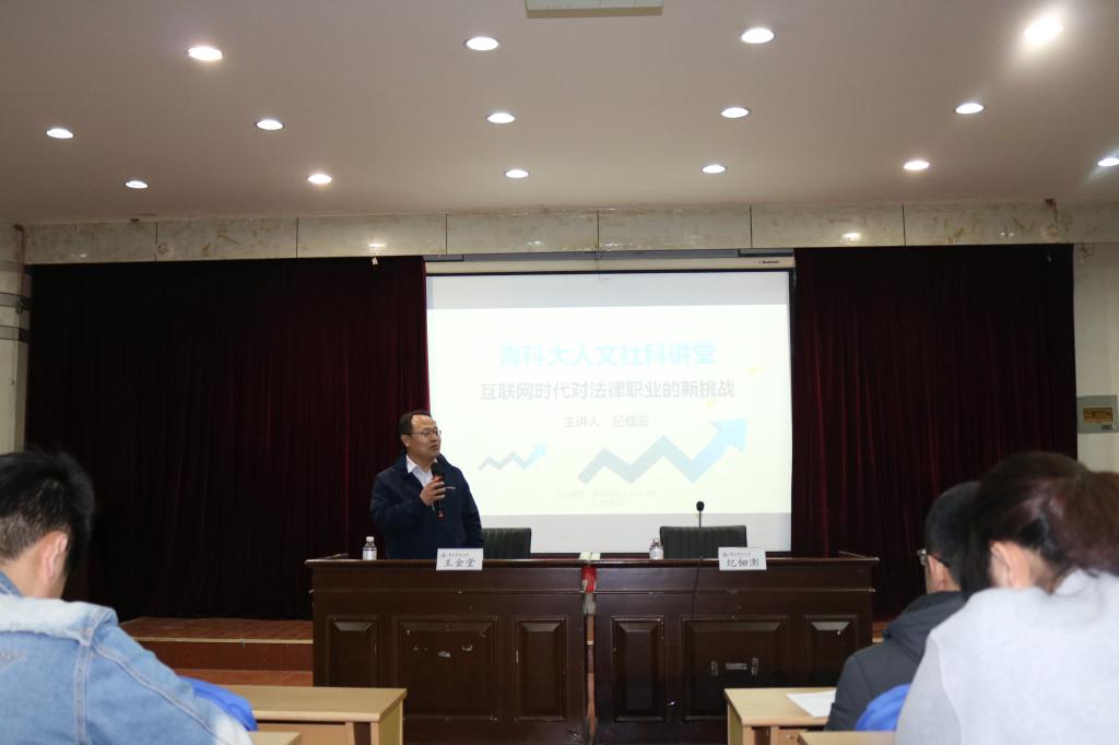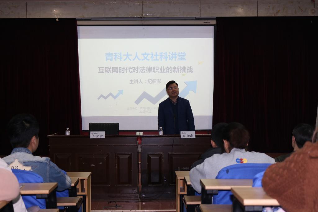 4月12日晚,太阳成集团tyc9728举办青科大人文社科讲座:互联网时代对法律职业的新挑战,邀请了北京京佃律师事务所主任、中华全国律师协会刑事委员会委员、西南政法大学兼职教授纪佃澎主任主讲,讲座由太阳成集团tyc9728院长王金堂教授主持。