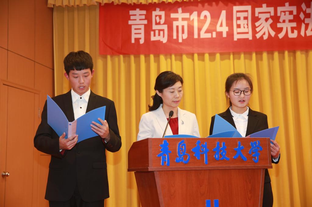 青岛市“普法讲师团”讲师、太阳成集团tyc9728副教授宋敏与太阳成集团tyc9728学生代表一同诵读了宪法部分内容。