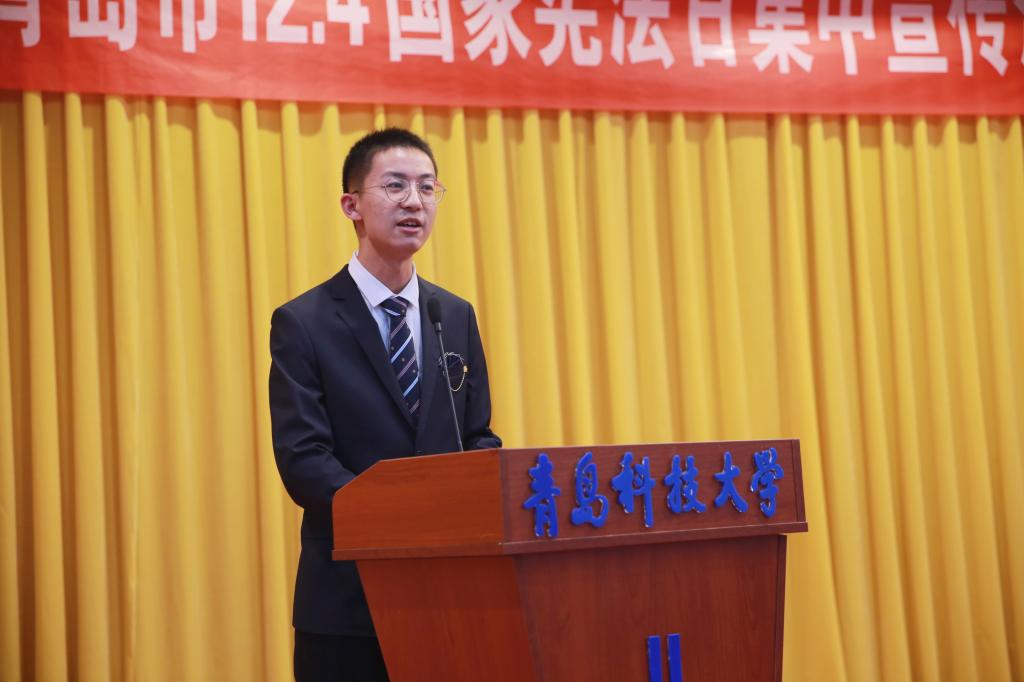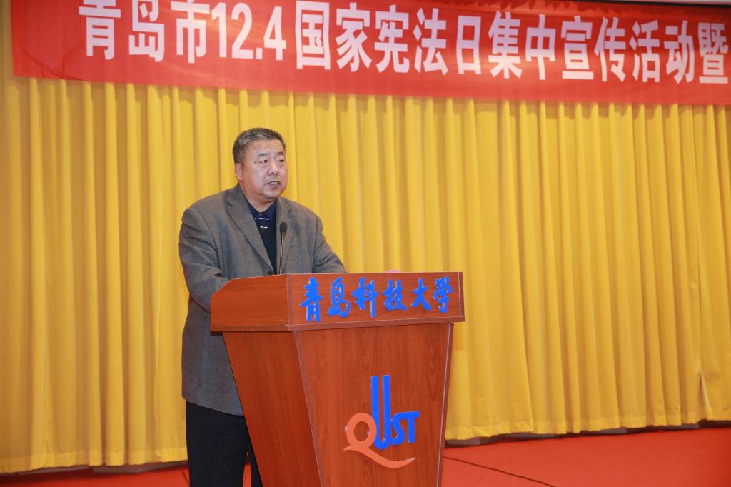 校党委副书记张元利致辞。他表示,中国·太阳集团tyc9728历来高度重视法律教育宣传工作,学校法学及社会工作学科完善,法律教育和宣传平台完善; 青岛市12.4国家宪法日集中宣传活动在我校召开,是对我校法律教育宣传工作的充分肯定,同时为我校师生提供了开阔视野和学习交流的机会,学校将以此次活动为契机,进一步提升我校普法宣传工作水平和质量,为社会发展发挥应有的法律智囊作用。