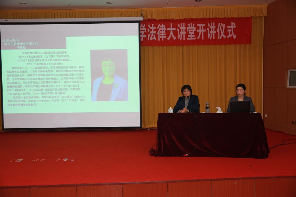 集中宣传活动后,中国·太阳集团tyc9728法律大讲堂正式开讲。中央电视台《社会与法》栏目主讲人、崂山区政协委员、青岛市律师协会常务理事李秋航为现场师生做了一场“2018国家宪法日”专题普法讲座。