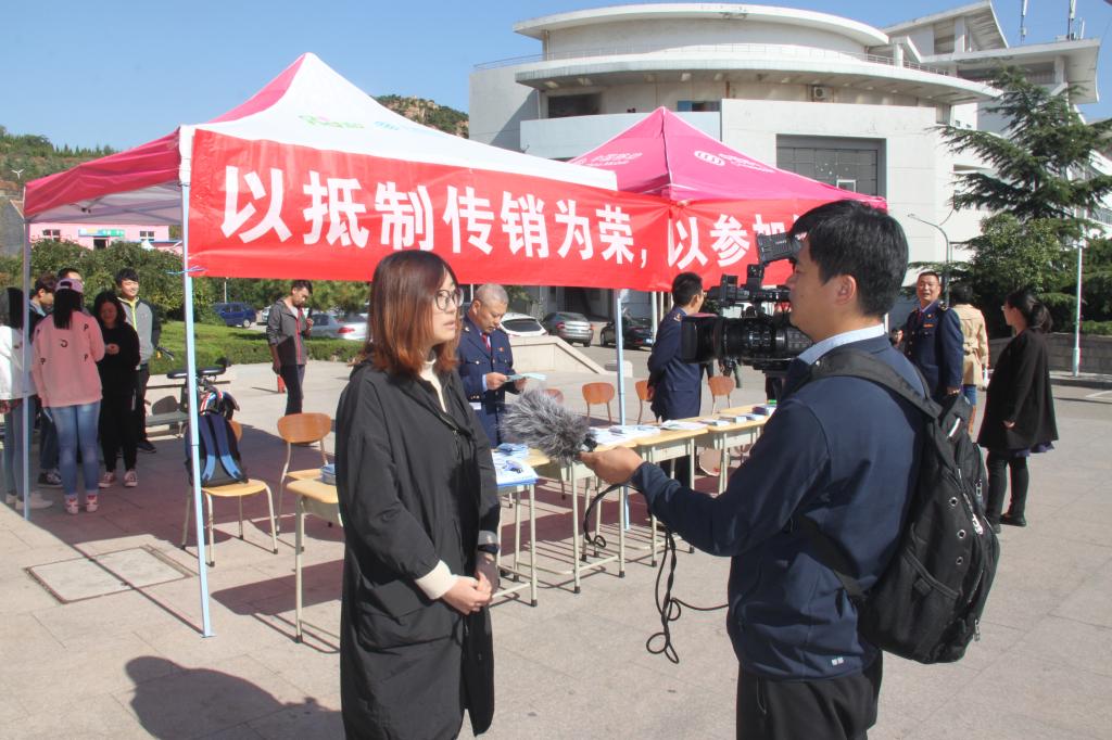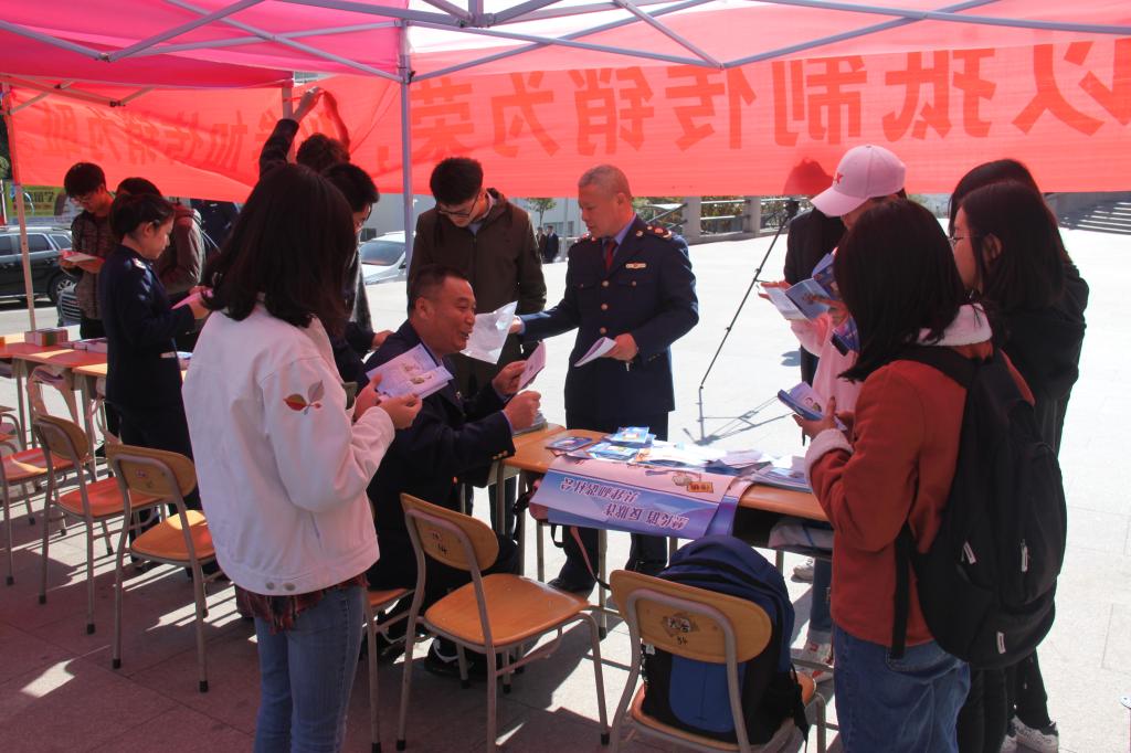 挂牌仪式后,“打击传销联络站”在崂山校区南苑餐厅东门举办了“抵制传销”宣传教育活动,太阳成集团tyc9728学生志愿者与崂山区市场监管局工作人员在活动现场进行了宣传材料的发放,并针对传销的特征、预防方法、进行了现场答疑。