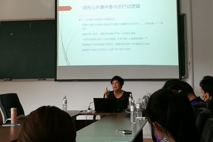 白淑英教授经过简要的自我介绍后,从“行动类型化与多重效应”、“锚定内隐的情感经验”等几个方面,从目前社会学最前沿的理论知识的角度,指出,目前我国网民的参与主要是由一个又一个的具有话题型的“事件”所引起,又经过具有强烈认知特点的“情感”的推动,目前是我们国家网民参与的最主要形式。白淑英教授又通过“陕西榆林产妇事件”的网民言论参与等案例,对上述观点做了进一步的阐释。白教授在最后指出:在社会学家看来,行动是具有理性或者非理性的。但是网络事件中的网民行动,不能简单地用理性或者非理性来涵盖。它既包括情绪、情感等非理性行为,也包含了通过公共参与影响政府的工具理性行为,还包含了正义、真、美等的价值理性行动,它更具有复杂性。白淑英教授鼓励同学们对如何在既保持网民广泛参与和保持社会主流共识的前提下,实现网络环境的现代化治理进行研究。
