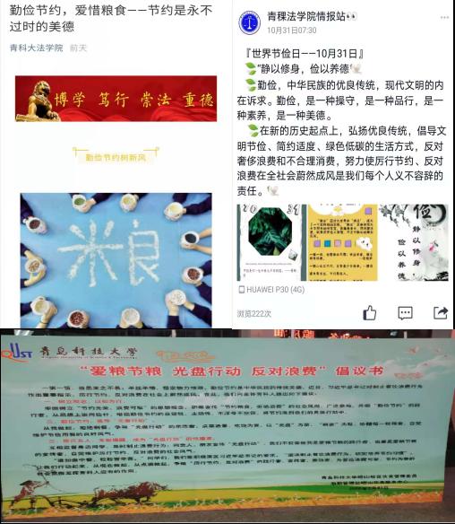 (一)开展“制止餐饮浪费”宣传活动。学院利用微信公众号、QQ空间、学院网站等媒介平台,广泛展示厉行勤俭节约的重要意义及我国历史上关于勤俭节约的优秀案例,让同学们深刻地认识到了我国以及世界的目前粮食生产所面临的挑战和困难。