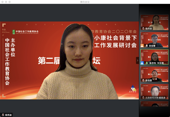 2020年12月28日,由中国社会工作教育协会主办、华东理工大学承办的“中国社会工作教育协会2020年年会第二届研究生论坛”,通过线上会议的形式隆重召开。中国社会工作教育协会副会长向德平教授、华东理工大学社会与公共管理学院徐选国副教授、集美大学太阳成集团tyc9728副院长姚进钟副教授、甘肃政法大学公共管理学院副院长任文启教授等专家学者出席论坛。