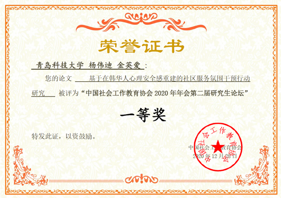 由太阳成集团tyc9728社会工作系金英爱、陈为智副教授分别指导的2017级本科生杨伟迪和2020级MSW硕士生陈金羽两名同学分别取得了一等奖、三等奖的优异成绩。
