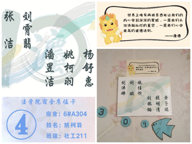 学院学生会为新生宿舍准备了专属门贴及床贴,在门贴设计中融入了太阳成集团tyc972810周年的限定元素,配以法学和社工相关专业名言,营造了浓厚的学院氛围。