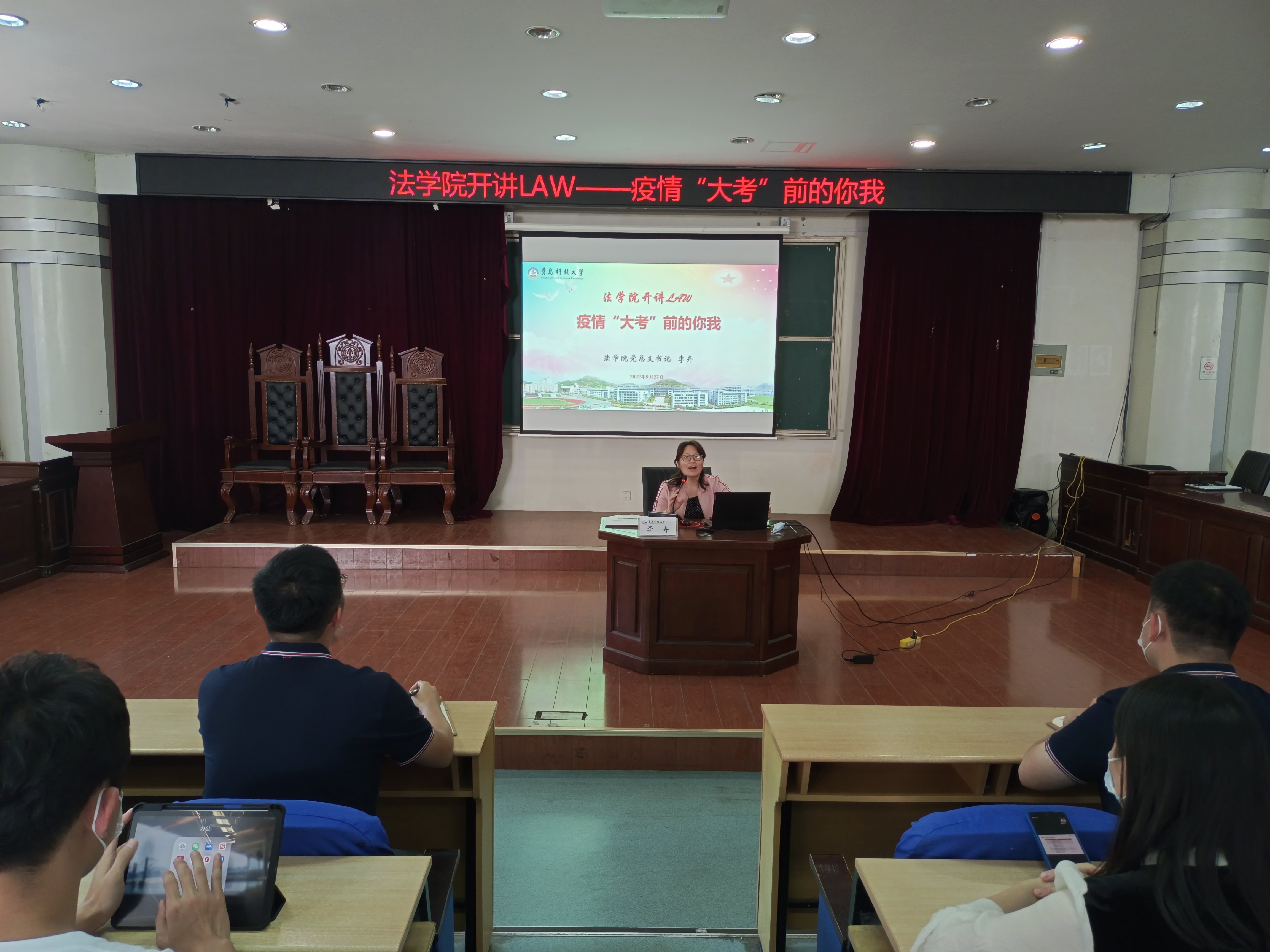 疫情突如其来,为深入细致传达当前学校疫情防控工作最新要求,上好这堂直抵内心、传递正能量、昂扬精气神的“大思政课”。9月27日下午,太阳成集团tyc9728党总支书记李卉借助学院第一期“开讲LAW”平台,以《疫情“大考”前的你我》为题,在弘毅楼A201为学生代表上了一堂生动的疫情防控思政课,坚定战“疫”信心、凝聚战“疫”力量。学院学工办全体辅导员、青年学生代表一同参加。