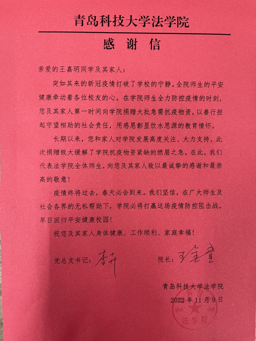 是什么让王嘉玥同学在当前疫情防控的严峻形势下,在防疫物资的极度匮乏的情况下挺身而出?是一名新时代青年学生的责任与担当!王嘉玥虽不能像医护人员一样冲在最前线,但她希望通过捐赠防疫物资为校园疫情防控工作助力,为师生健康安全增添一份保障,为学校师生坚定必胜信心,为科大战胜疫情按下“快进键”,为科大战“疫”行动奉献自己的青春力量!