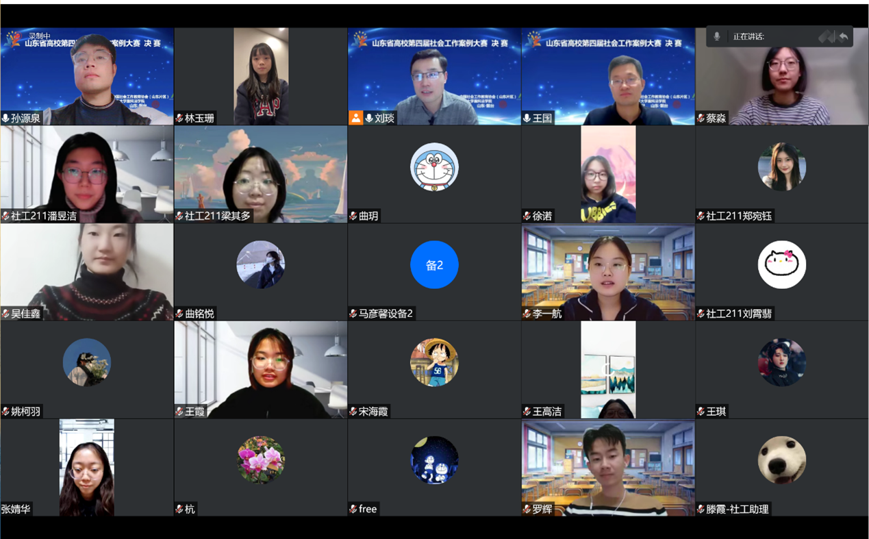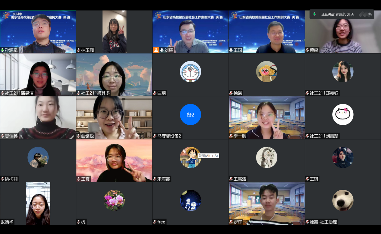 决赛通过线上参与的方式,经过严格的评审与激烈的角逐,李一航团队的案例《“向阳花开”:优势视角理论下社会工作对事实无人抚养儿童的综合介入》(指导老师:刘琰等)荣获本科生组一等奖;徐诺团队的案例《“乐在耆中”:构建陪伴体系提升高龄老年夫妻幸福感项目》(指导老师:王卫国等)荣获本科生组二等奖;林玉珊团队的案例《家暴不分性别,构建家庭和谐——个案工作介入男性反家暴项目》(指导老师:陈为智等)荣获研究生组二等奖;吴佳鑫团队的案例《“黄发垂髫,怡然自乐”:随迁老人隔代抚养压力缓解小组的实务案例》(指导老师:徐从德)、刘兆坤团队的案例《“古稀之年再出发”-叙事治疗模式下高龄老人生命意义重构个案服务》(指导老师:陈为智)荣获本科生组三等奖;曲玥团队的案例《“守护疫点微光,予她温暖同行”——危机干预模式下对防疫工作中社区工作者的个案介入》(指导老师:陈为智等)、宋海霞团队的案例《让爱“双向流动”-结构家庭治疗模式介入亲子关系的干预研究》(指导老师:张行)、陆月月团队的案例《“青衿之志,履践致远”——理性情绪治疗模式下高考复读生的个案工作》(指导老师:陈为智)荣获研究生组三等奖。