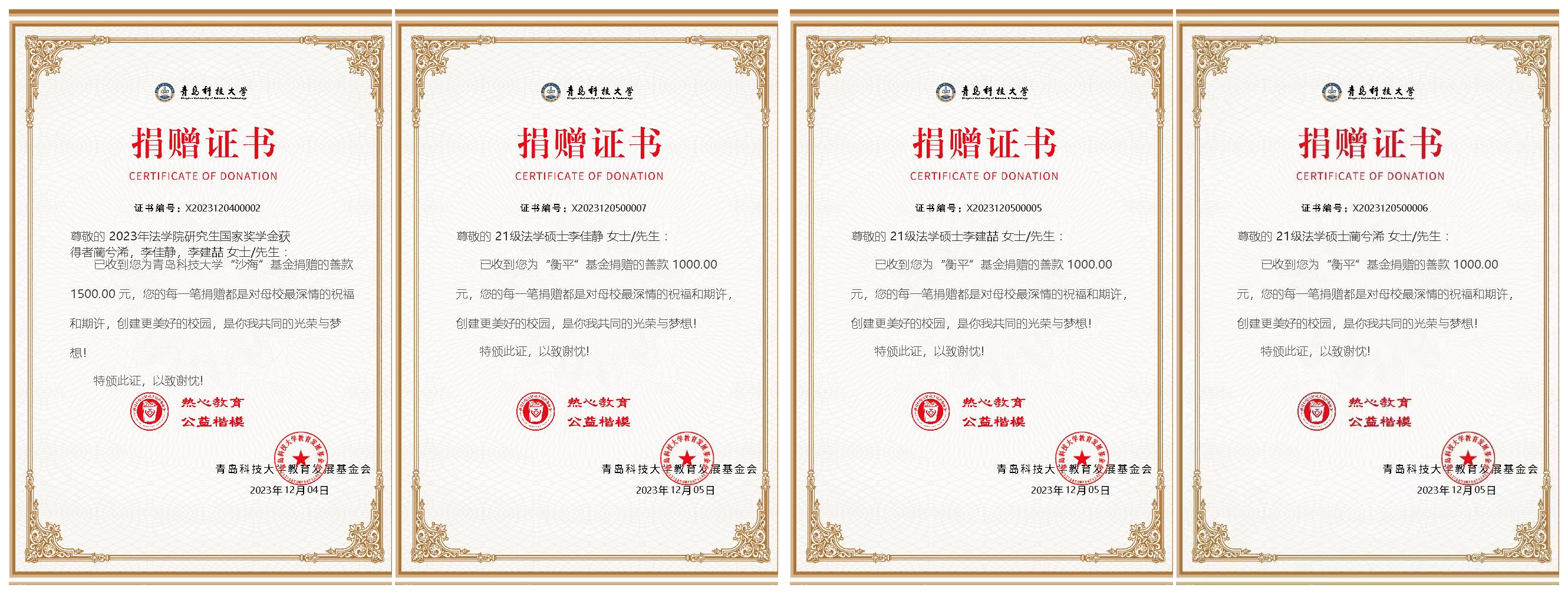三位捐赠者表示,饮水思源,缘木思本。取得今天的成绩离不开学校和学院的悉心培养,三位学生秉承着“明德、笃学、弘毅、拓新”的校训和“崇法、重德、博学、笃行”的院训,不忘初心,踔厉奋发。他们的捐赠既是对学校和学院培养与关怀的回馈,也是对学院和老师们支持的感恩,希望能对学院各项事业的开展起到积极作用,同时对提高学生专业综合素质和学院的高质量发展作出应有的贡献。学院对三位获奖者的捐赠表示了感谢,并表示将以此为契机,进一步推动学院的教学和科研和人才培养工作,为学校“特色鲜明,走在前列”高质量发展做出更大的贡献。