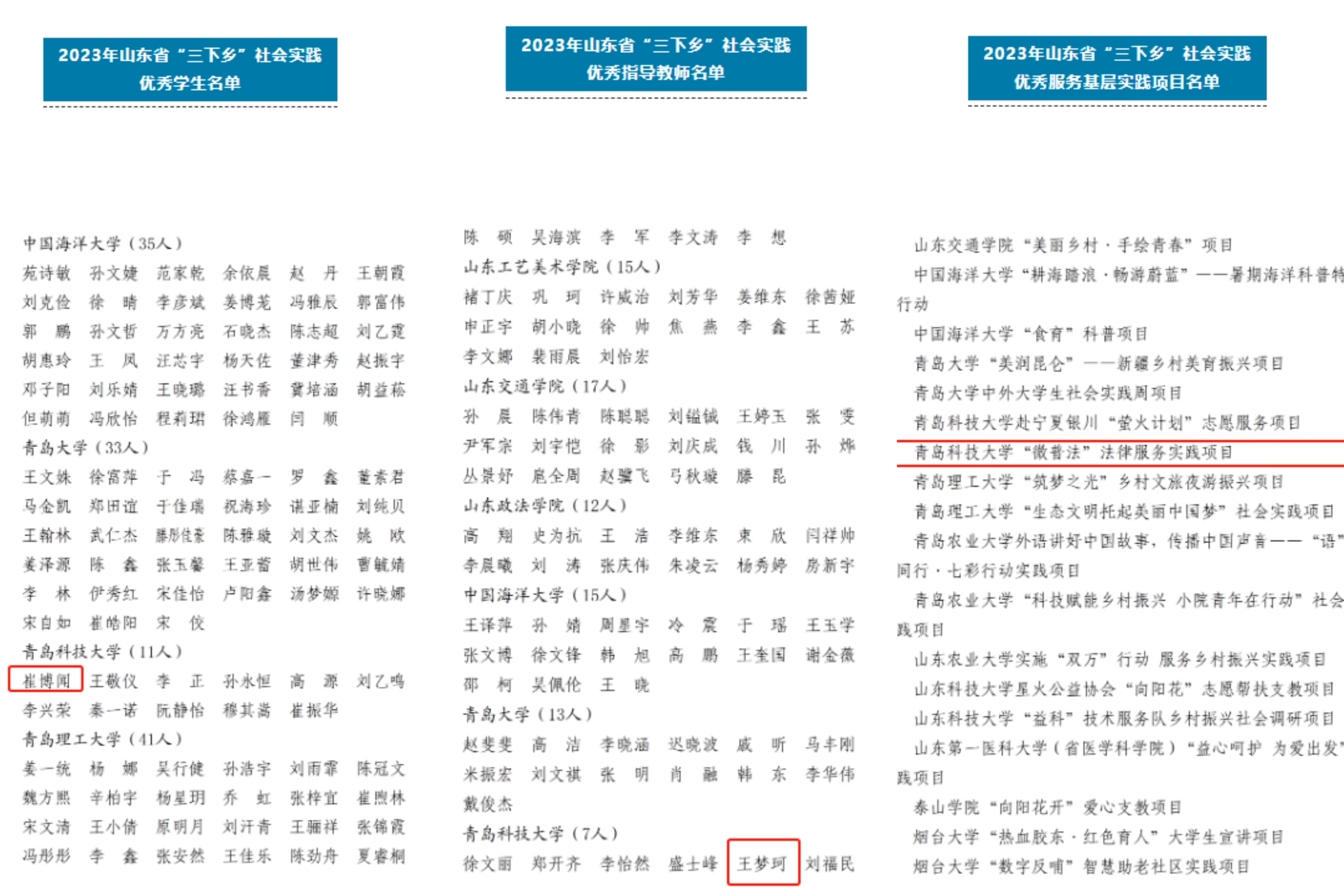 近日,2023年山东省暑期“三下乡”社会实践获奖名单公布,太阳成集团tyc9728法学223班学生崔博闻获评“优秀学生”,王梦珂获评“优秀指导教师”,“微普法”法律服务实践项目获评“优秀服务基层实践项目”。
