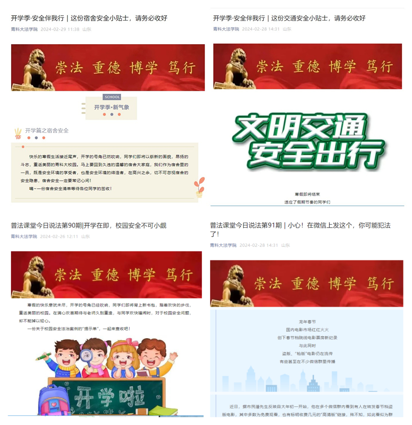 强化担当,吹响复工复学集结号。副院长陈为智组织学习学校安全工作的重要安排部署和安全管理规定。全体辅导员和班主任组织全体学生线上线下全面开展“开学第一课”主题班会,通过开展宿舍走访、谈心谈话等方式,做好补考学生学业辅导、学困帮扶及诚信考试等工作,并梳理开学季情绪、心理等常见问题,制作暖心推文《安全伴我行这份宿舍安全小贴士,请务必守好》《这份交通安全小贴士,请务必守好》《开学在即,校园安全不可小觑》等,引导学生将安全红线时刻铭记于心。同时,全体辅导员结合年级重点工作及学生实际,以年级大会、学生骨干大会等方式,系统梳理新学期党团建设、学风建设、学科竞赛、升学就业等重点任务,助力学生明晰学期工作方向、规划任务清单,确保安全稳定工作落细落实。