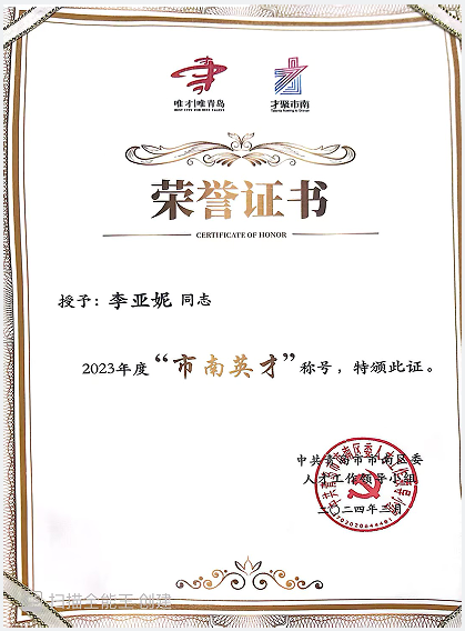 “市南英才”为2023年首次评选,是市南拔尖人才称号的延续,设置现代服务业、产学研、数字经济、教育体育、健康医疗、企业管理、专业技能、社科文化艺术、综合9个组别,经过五个月的评审,共有121位人才入选。“市南英才”评选对象是为市南区发展做出突出贡献,并在本行业和专业领域内享有较高声誉,被公认为市南区行业带头人或专业人才的优秀人士。李亚妮老师是本次评选中唯一一位社会工作行业的代表。
