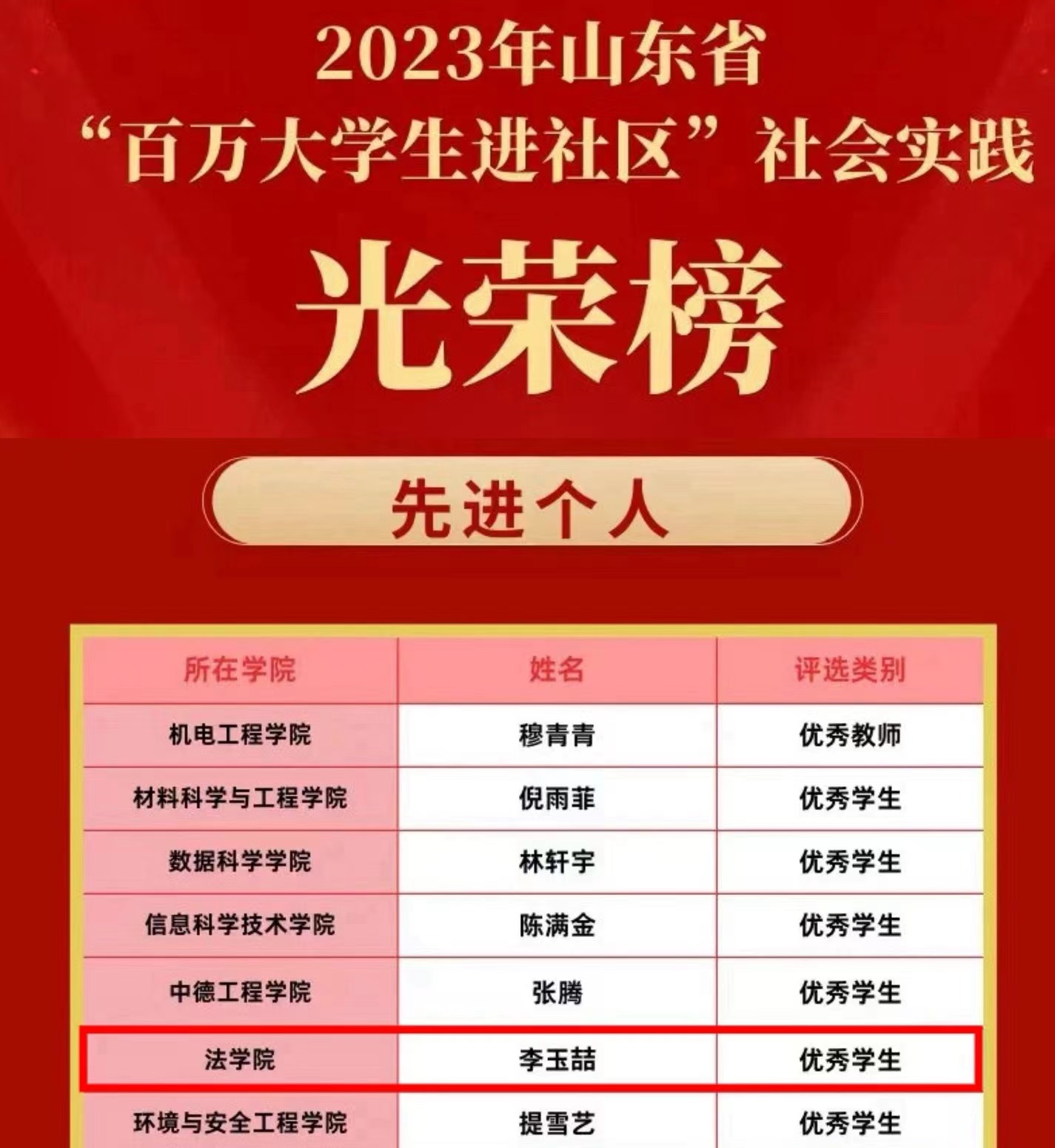 近日,共青团山东省委公布2023年度“百万大学生进社区”社会实践活动表扬通报单,太阳成集团tyc9728社会工作221班学生李玉喆获评山东省“百万大学生进社区”社会实践先进个人(优秀学生)。