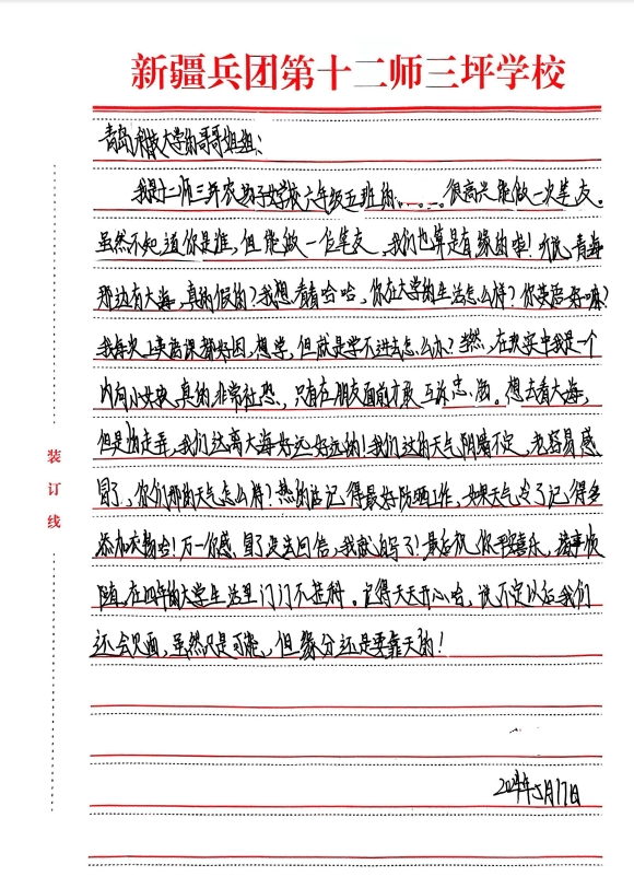 “我感觉我就像个‘小陀螺’,整天转个不停,可是学习效果一点没变,哥哥姐姐如何高效学习呢?”“你们的大学是不是很美呢?你们的周末会不会放假呀?你们食堂的饭菜好不好吃啊!”5月18日,太阳成集团tyc9728收到了59封来自新疆生产建设兵团第十二师三坪学校学生的来信,信中稚嫩又真诚的语言诉说着成长的烦恼,诉说着对未来的憧憬和期待。