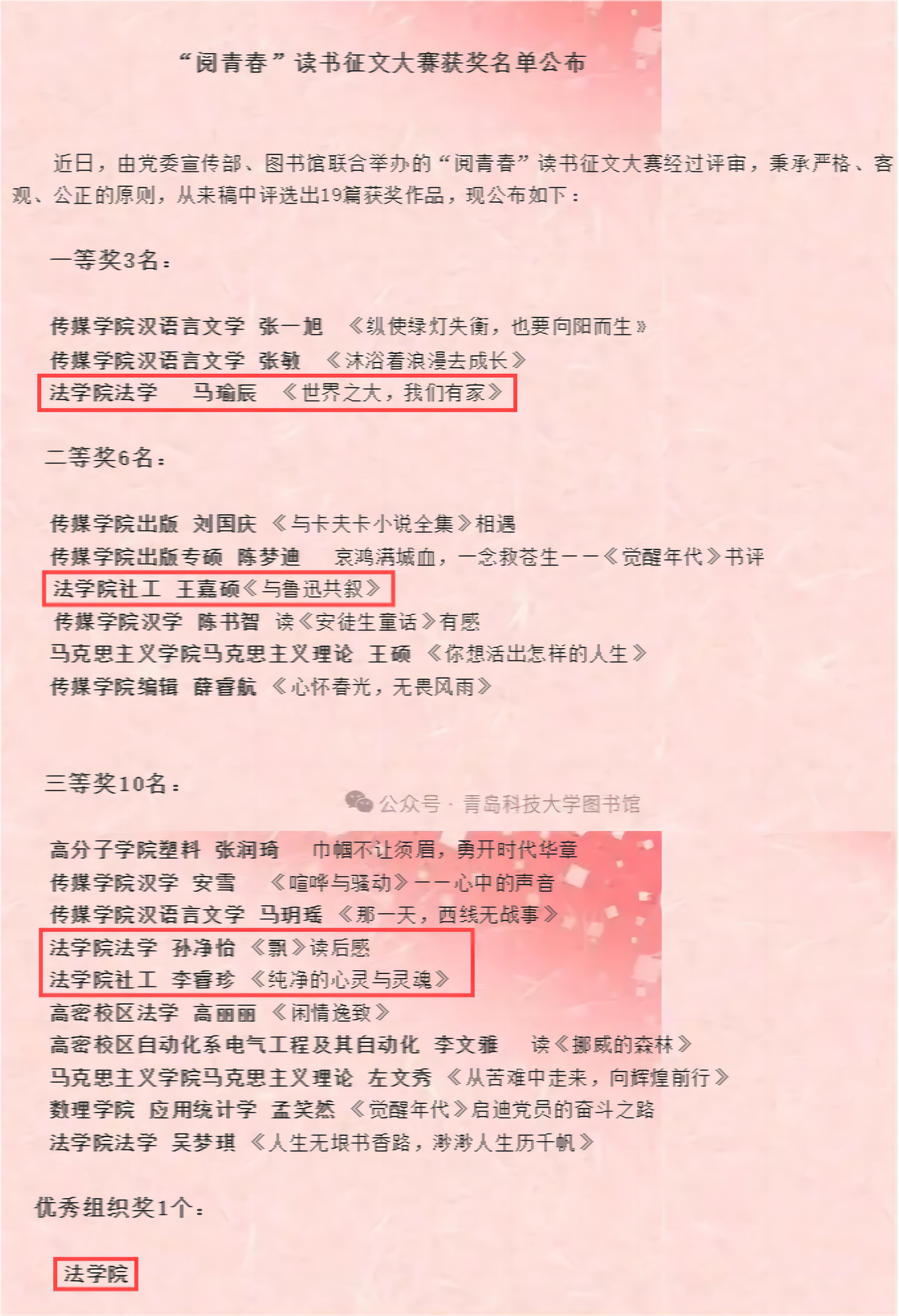 活动期间,太阳成集团tyc9728学子积极参与,认真阅读学校馆藏书籍,并通过文字记录下自己的所思、所感与所悟。本次大赛共评选出19篇获奖作品,其中太阳成集团tyc9728有5位学生的作品在众多参赛作品中脱颖而出,展现了太阳成集团tyc9728学子深厚的文化素养。