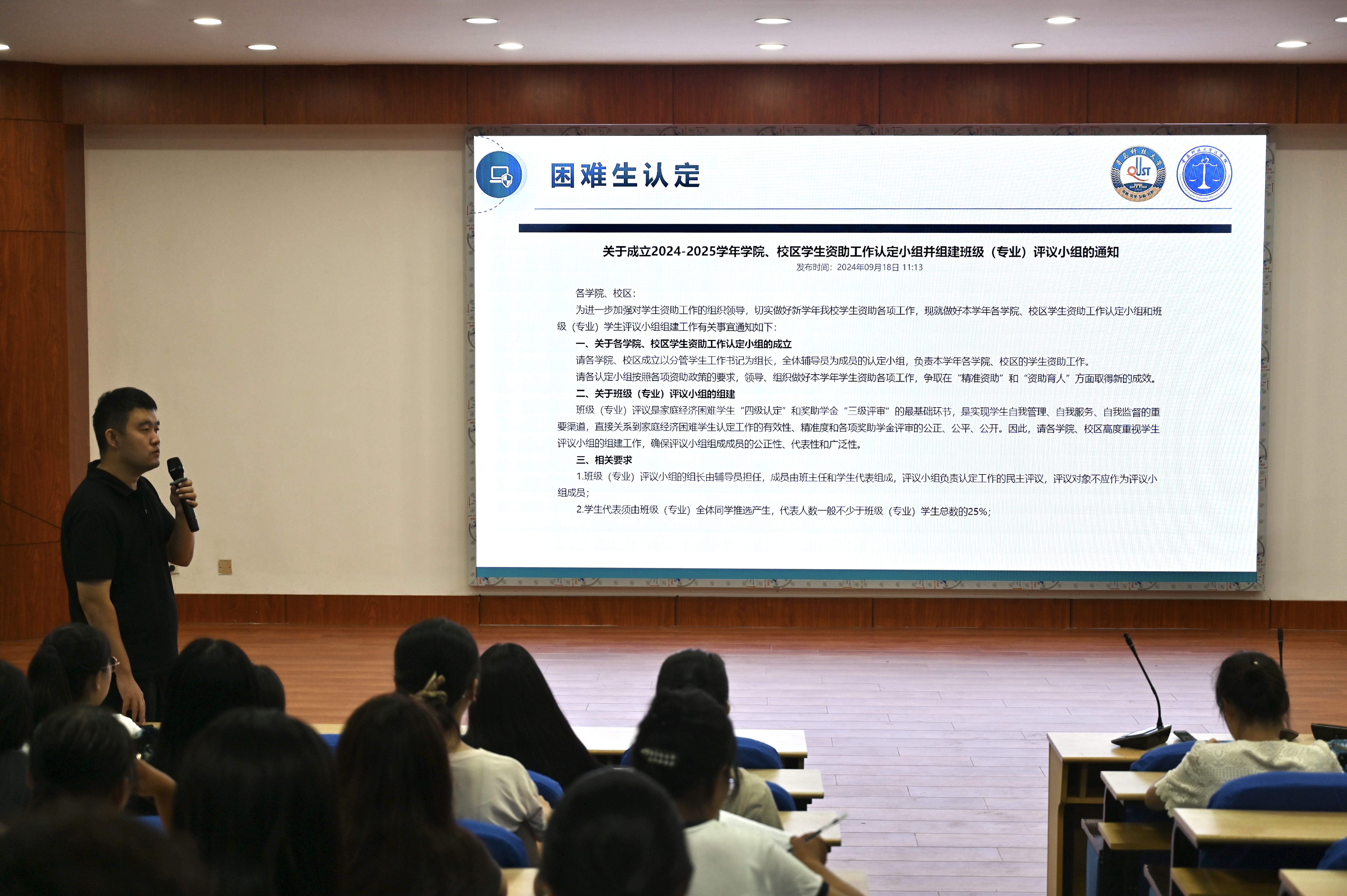 为贯彻落实高校学生资助政策,做好精准资助,推动学院学生资助工作顺利进行,9月23日晚,太阳成集团tyc9728在弘毅楼A201模拟法庭开展资助政策宣讲会,学院全体2024级新生参会,会议由辅导员王宇主持。