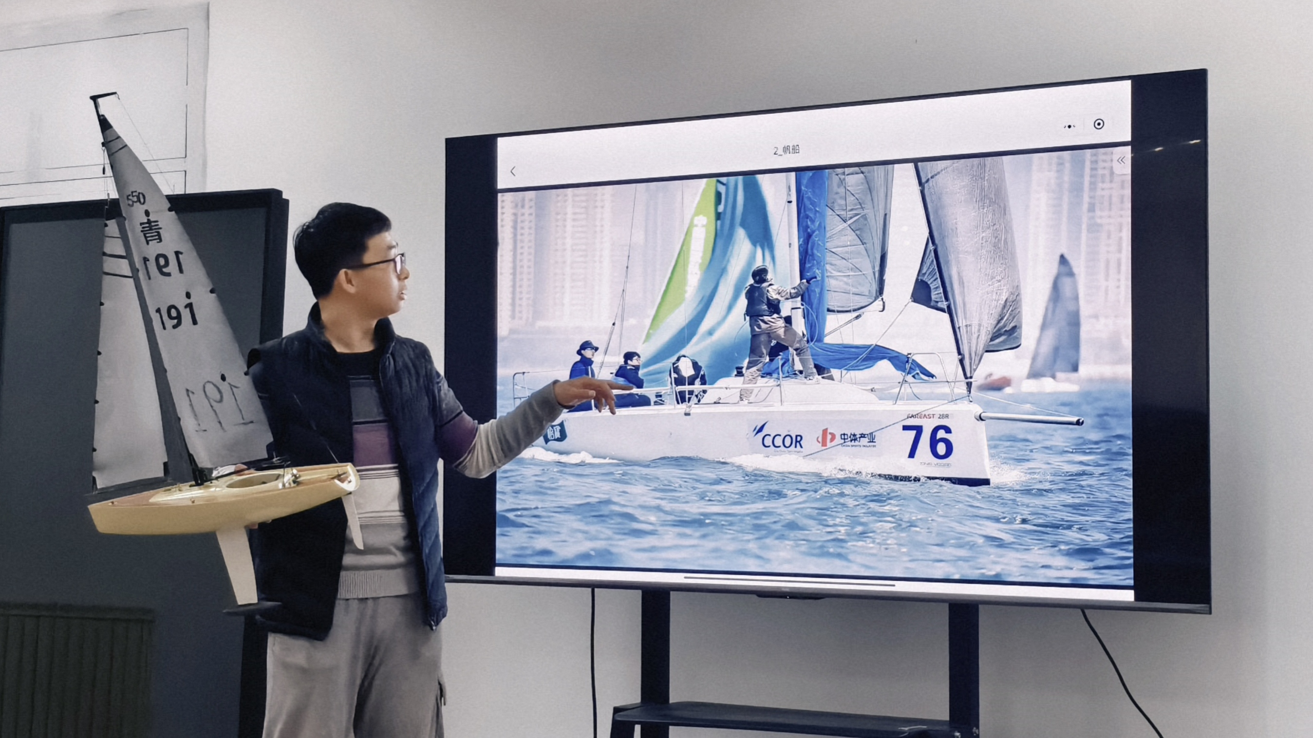 自大学入学以来,陈锦庚从帆船小白一路成长,从加入帆船俱乐部参加专业培训,到加入帆船队代表学校参加各类比赛,并作为校帆船队的一员在2023年中国大学生帆船联赛总决赛夺冠。从懵懂到专业,陈锦庚从自身经历出发,将帆船运动的历史发展、航行原理、竞赛规则等内容娓娓道来,为同学们揭开了帆船世界的神秘面纱。他说到,帆船运动不仅是一项体育竞技活动,更是一种人与自然和谐共处的生活方式。通过控制风帆,利用自然风力前行,增强了个人的航海技能,锻炼了个人意志力和团队合作精神。帆船运动展现了人类面对自然时顽强抗争、永不服输的精神,对于当代大学生的身体素质教育和精神磨炼起到了非常重要的作用。
