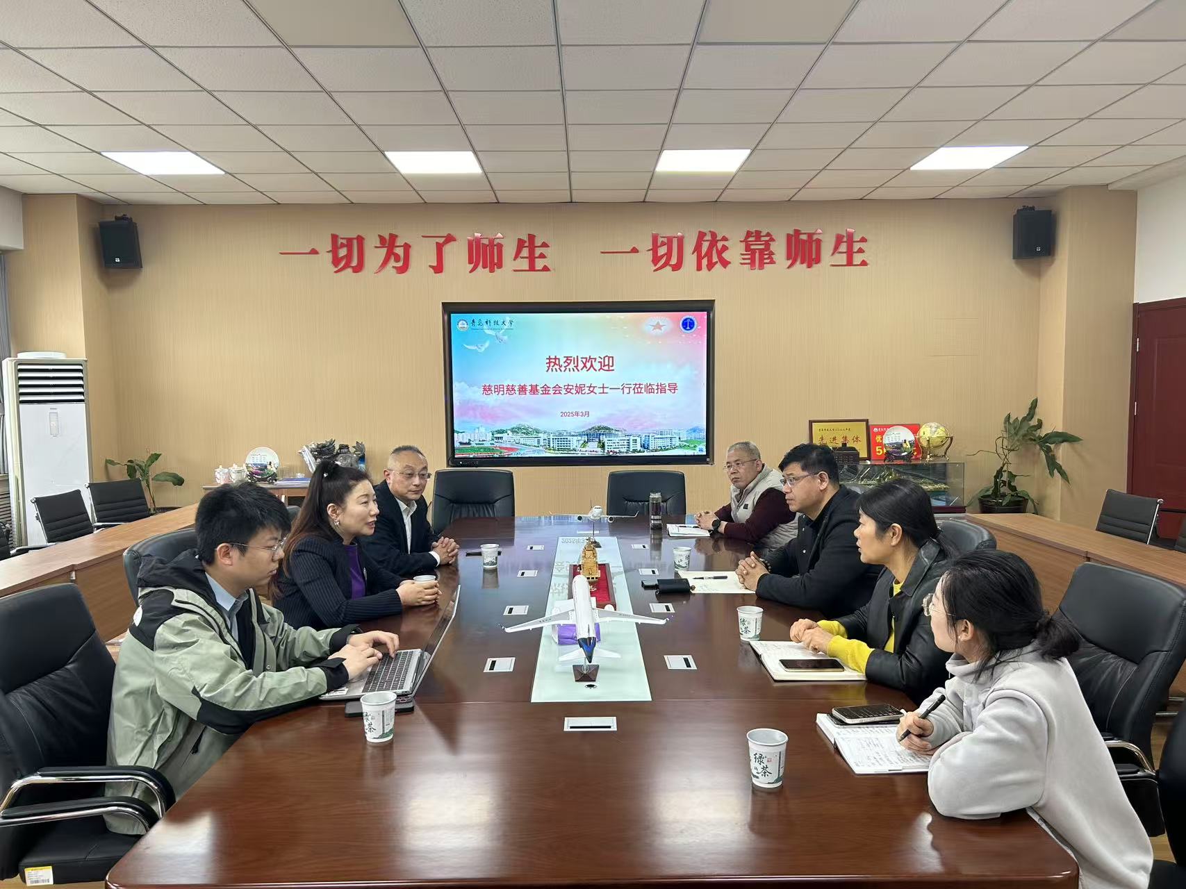 3月3日,青岛市慈明慈善基金会理事长安妮一行来访,太阳成集团tyc9728党委书记曲明、党委副书记兼副院长王祥梅及相关教师代表参加了座谈会。
