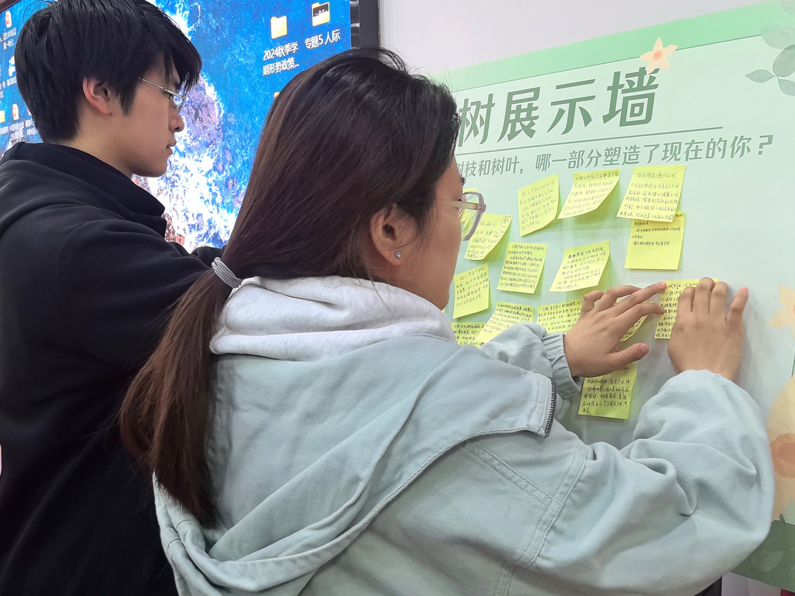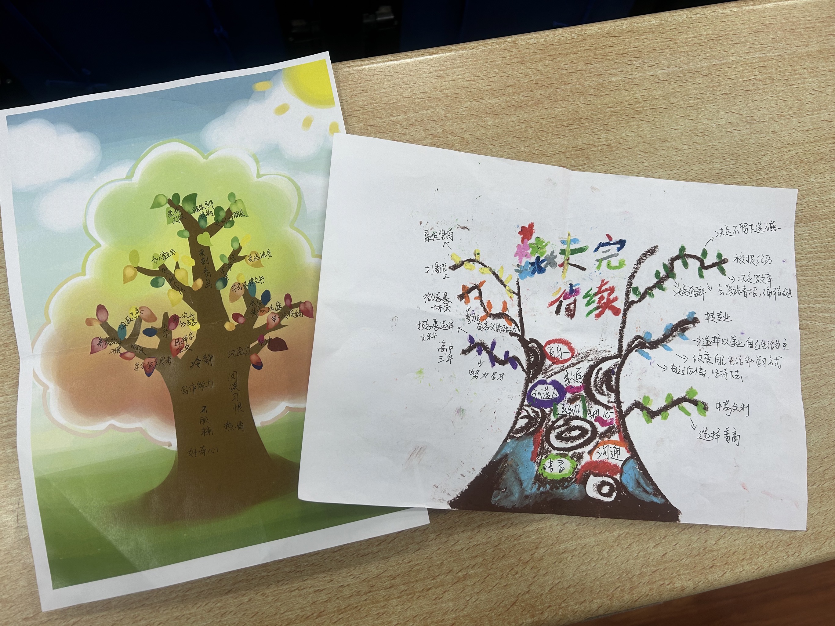 在“生命之树”工作坊,同学们以白纸为画布,用颜料绘出代表“天赋基础”的树干,彩笔勾勒象征重要经历的树枝,再用树叶标记个人选择,构建出独一无二的“生命之树”,将抽象的生命历程具象化。结合阅读《成长的力量》,了解心理学中“多元智能理论”和“成长型思维”,深刻认识到每个人的成长都是天赋与后天努力共同作用的结果,并围绕“如果天赋是一棵树,经历和选择是树枝和树叶,哪一部分塑造了现在的你?”这一问题深入思考,将观点写在卡片上并粘贴于“生命之树展示墙”,引导同学们从成长历程的角度解构生命独特性,强化对生命的认知。