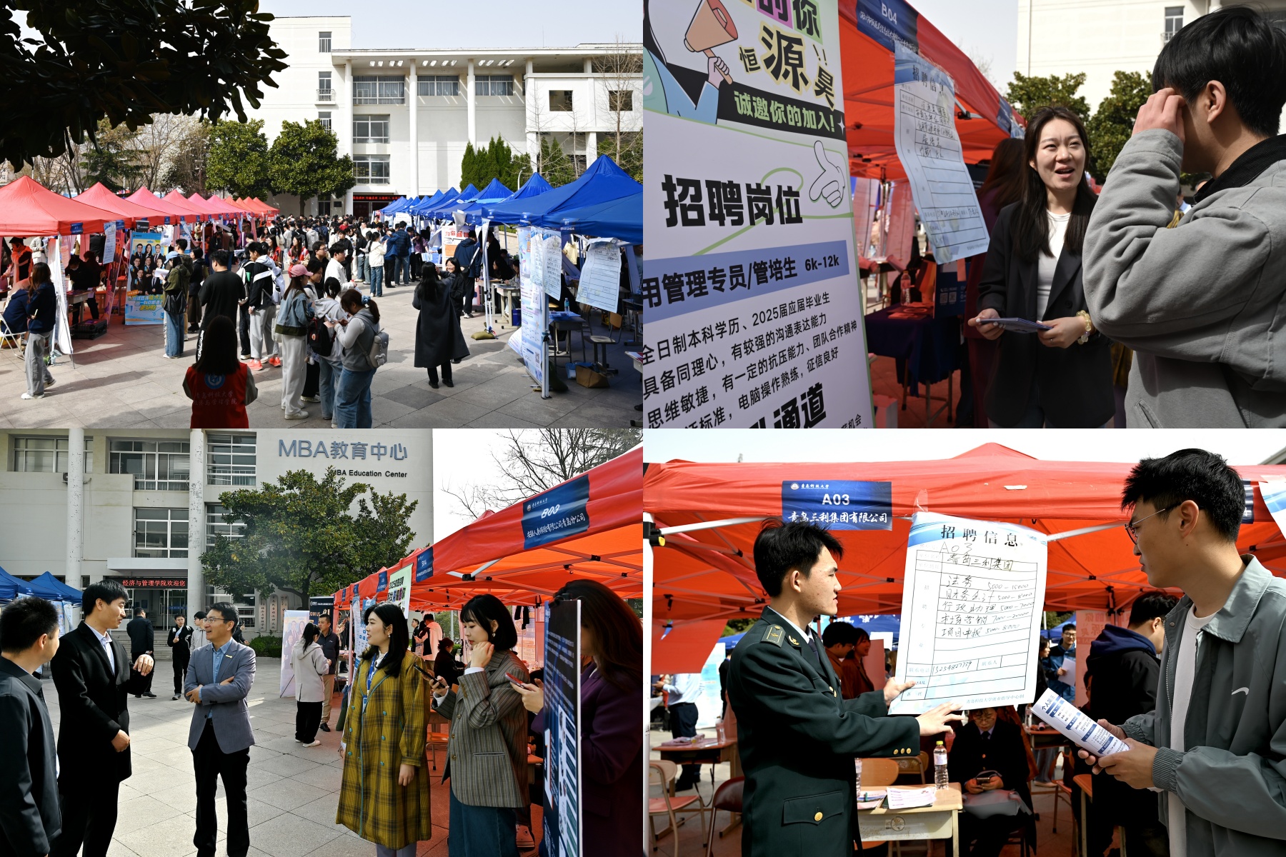 3月25日,太阳成集团tyc9728、经济与管理学院、马克思主义学院“‘经’彩启航,‘法’挥无限,‘马’到成功”2025届毕业生春季专场双选会在崂山校区弘毅广场举办,110余家省内外知名单位进校揽才,提供岗位数量1500余个。学校党委常委、副校长丁林亲临双选会现场,与用人单位、应聘学生进行交流,深入了解招聘现场情况,并对就业服务工作提出具体指导意见。