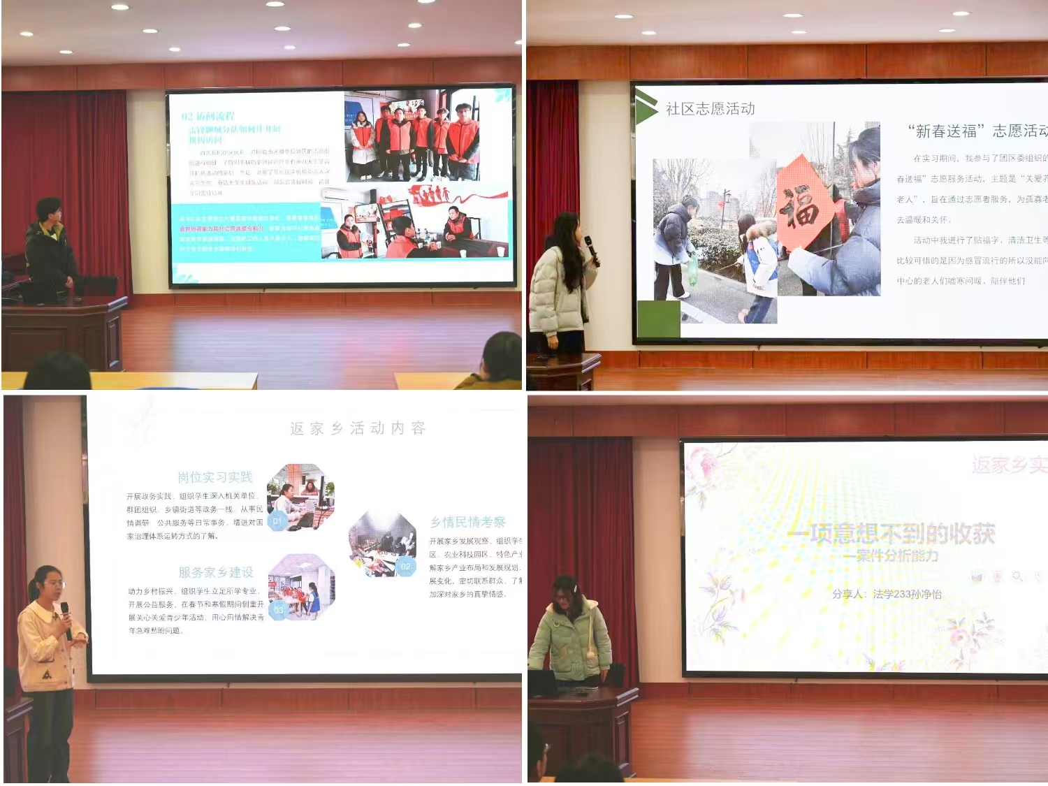 各实践团队从实践背景、实践内容、实践过程等多个方面,采取PPT、视频等方式展开分享。同学们通过生动的案例、翔实的数据和深刻的感悟,展示了他们在实践过程中的所见、所思、所感。在本次社会实践中,太阳成集团tyc9728青年学生将专业知识与社会实践深度结合,聚焦乡村振兴、基层服务、法律宣传等重点领域,充分发挥自身专业优势,积极开展法律知识普及、社会调研、法院实习等一系列丰富且扎实的实践活动。