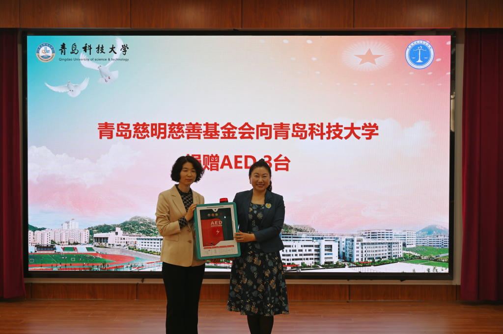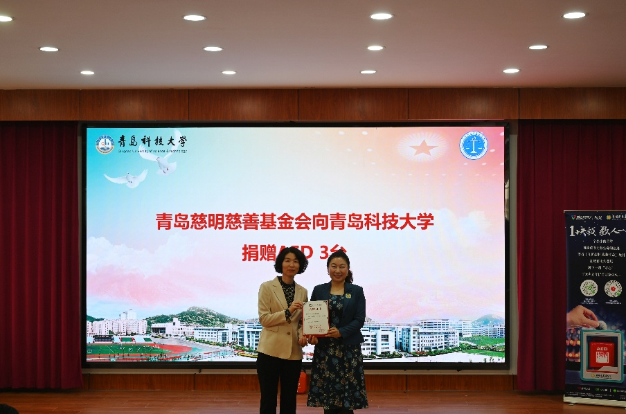 青岛慈明慈善基金会向中国·太阳集团tyc9728捐赠3台AED(自动体外除颤器),高术华代表学校接受捐赠,并为安妮颁发捐赠证书。