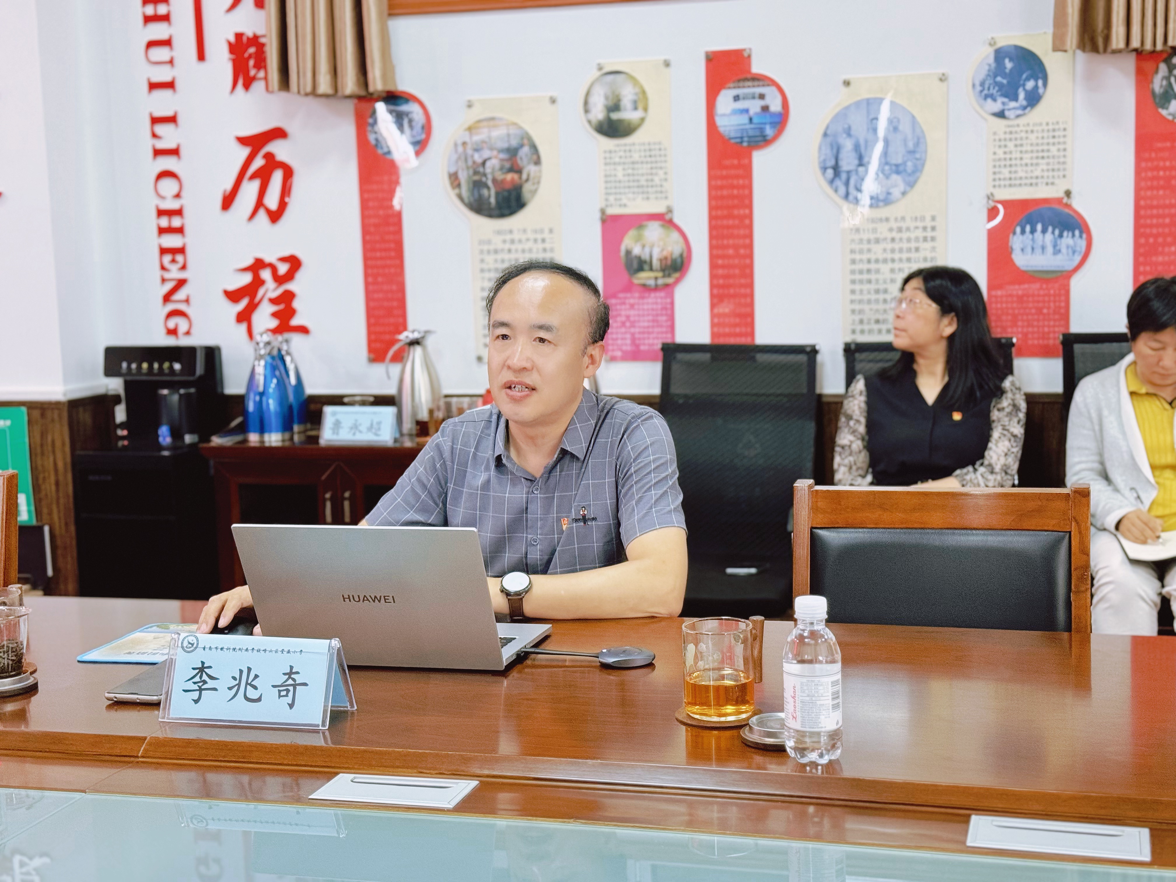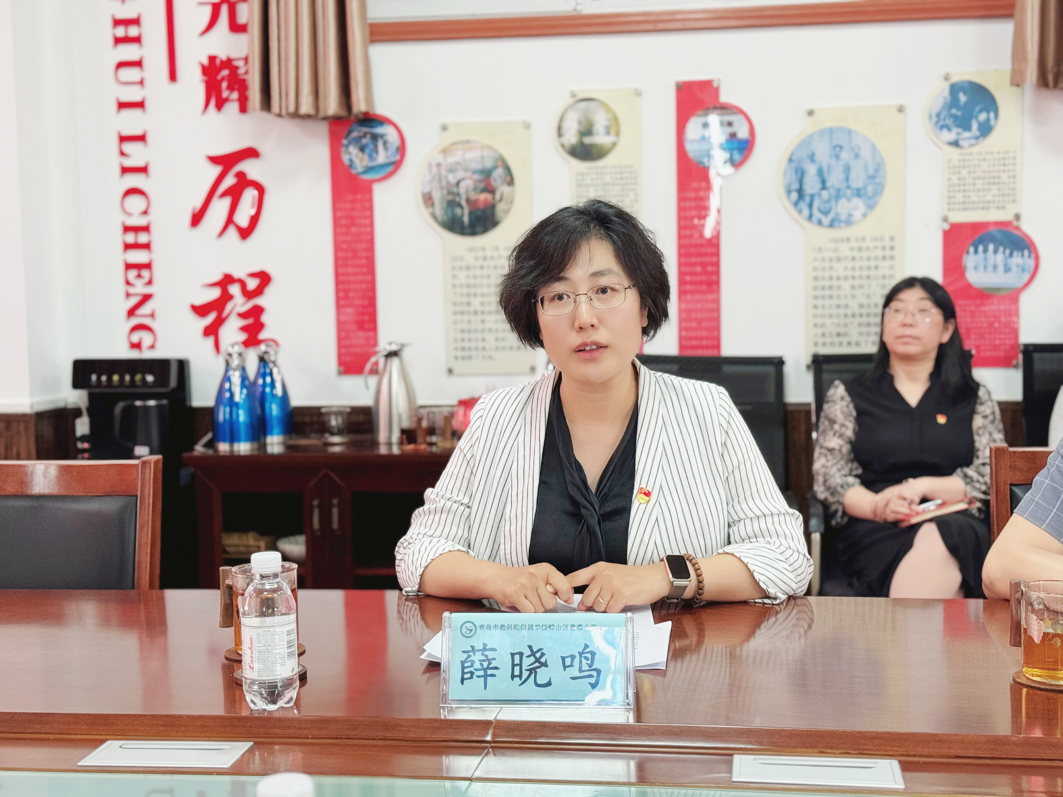 崂山区教体局副局长薛晓鸣介绍了崂山区教育系统党建建设情况。登瀛小学校长、党支部书记李兆奇对曲明一行表示诚挚的欢迎。他以“登高行远赢未来”为主题介绍了学校的办学历史沿革和教职工学生基本情况,展现了四代登瀛人的传承与坚守,以及学校的教育理念和精神文化。