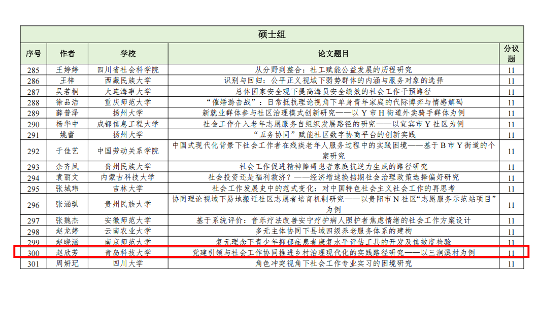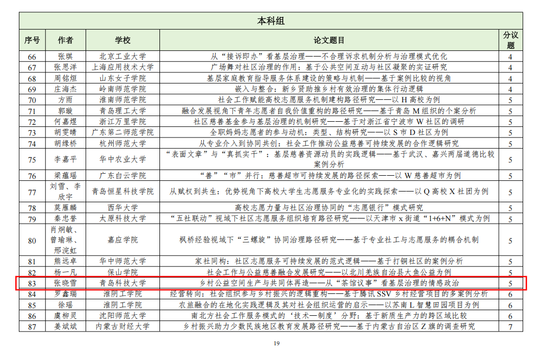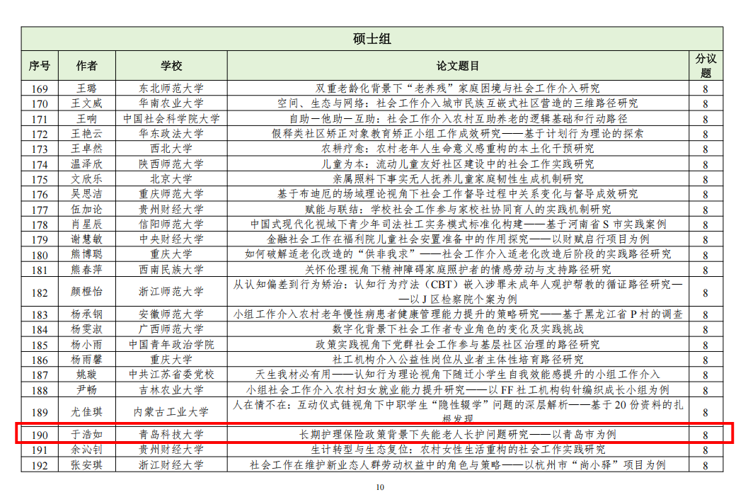 此次入选“第十七届中国社会工作大学生论坛暨第十届社会工作研究生论坛”,是对学院社会工作专业教学成果和学生专业能力的又一次肯定。期待入选的同学们在论坛中积极交流、碰撞思想,将青科大社工人的精神与实力传递给更多同行!同时,也希望更多青科大学子以他们为榜样,在社会工作领域不断钻研、实践,取得更优异的成绩,为推动社会工作事业发展贡献力量。