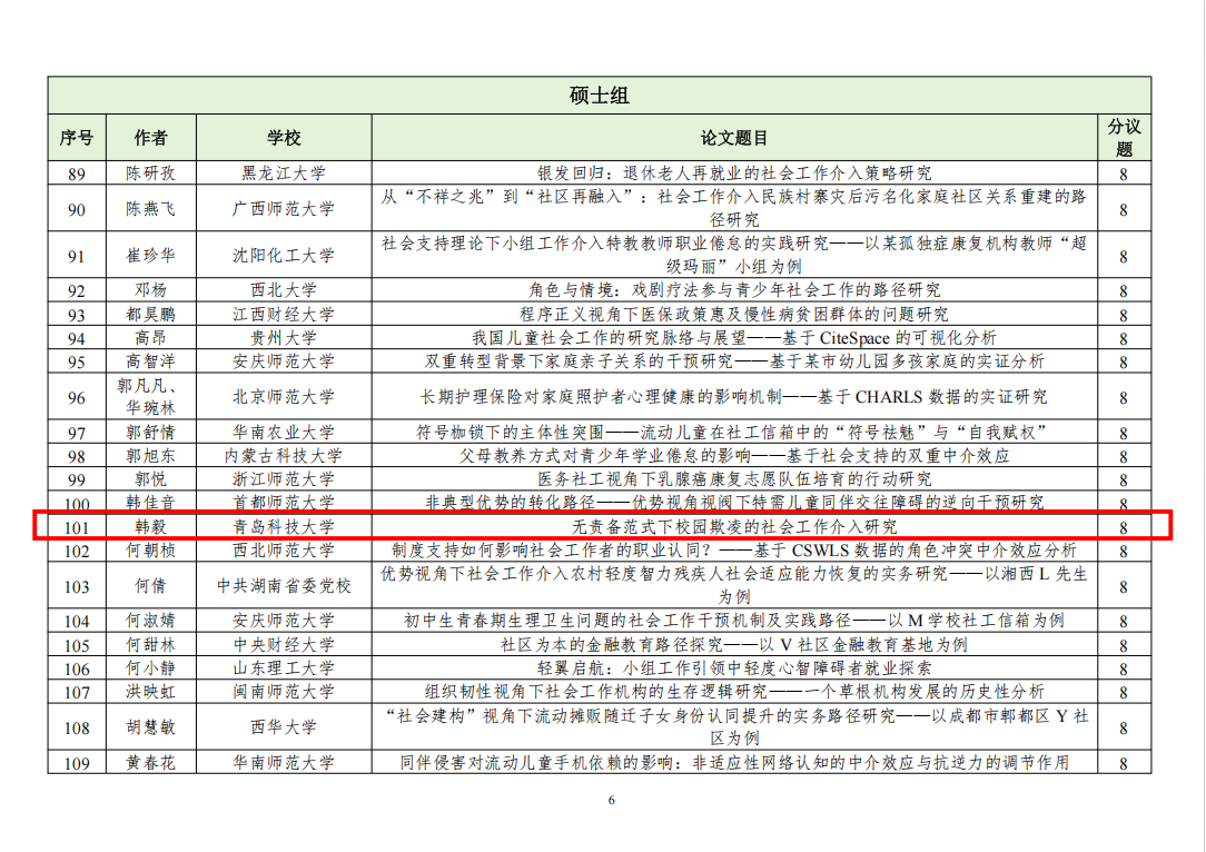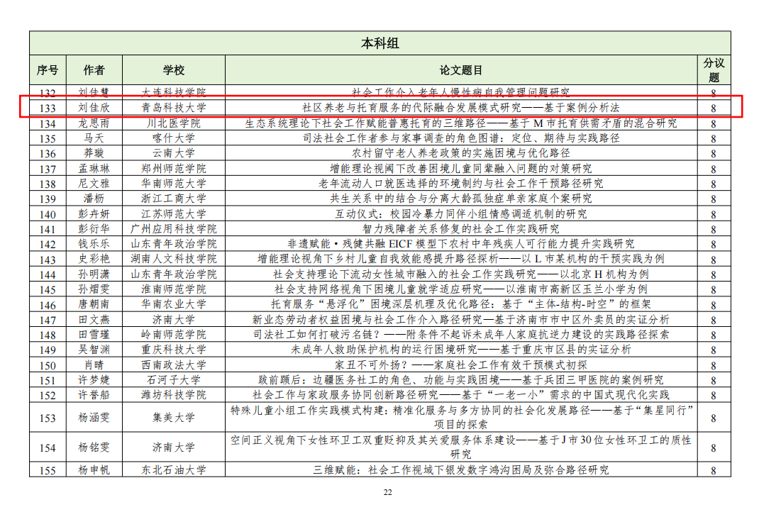 近日,中国社会工作教育协会发布“第十七届中国社会工作大学生论坛暨第十届社会工作研究生论坛”入选通知及名单,自征文通知发布以来,共收到稿件(摘要)831篇,经专家初评,入选549篇。太阳成集团tyc9728社会工作系3名硕士研究生和2名本科生论文入选。