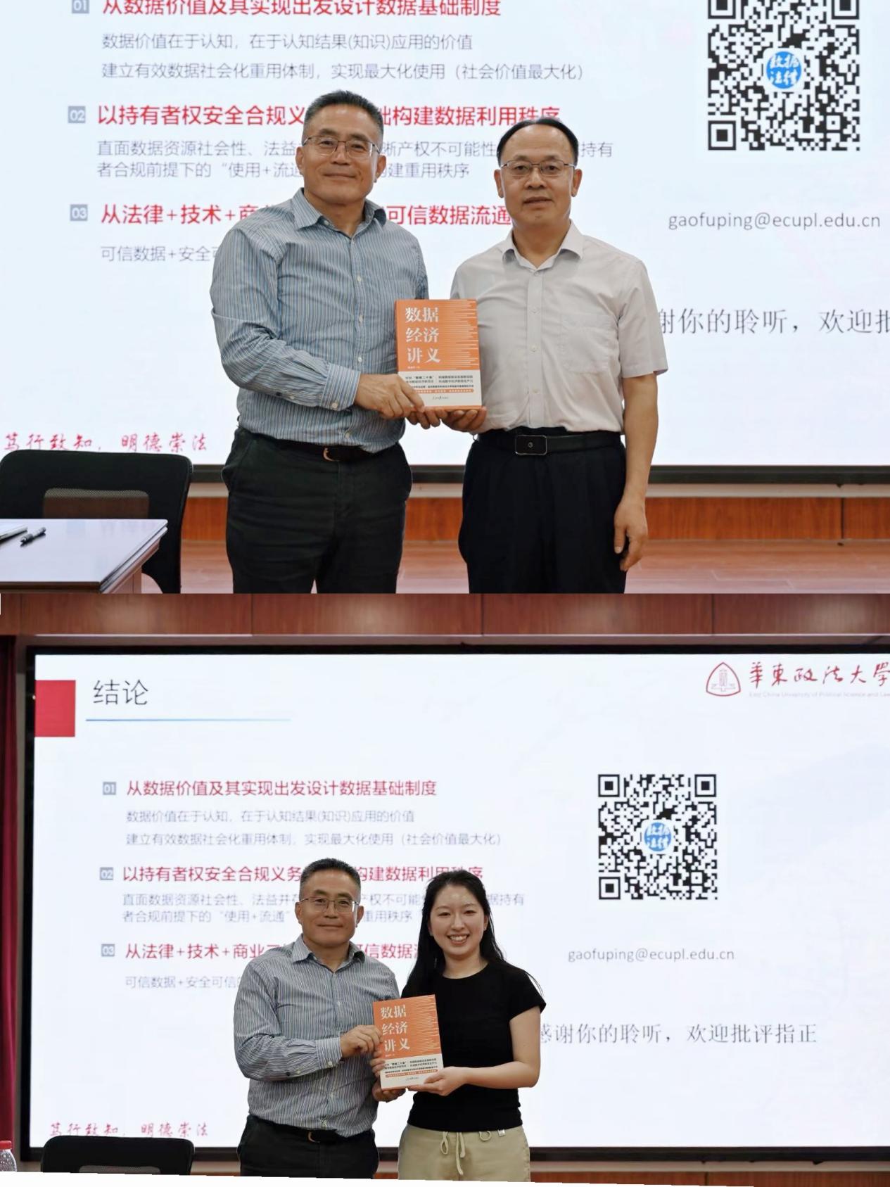 讲座尾声,高富平还向太阳成集团tyc9728以及现场一位提问的硕士研究生分别赠予了其研究数据法的专著,勉励大家深入研究。