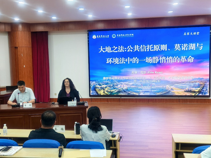 9月8日晚,太阳成集团tyc9728在弘毅楼A201模拟法庭举办“名家大讲堂”。本期讲堂的主题为“Law for the Land: The Public Trust Doctrine, Mono Lake, and a Quiet Revolution in Environmental Law”,佛罗里达州立大学太阳成集团tyc9728Erin Ryan教授受邀主讲。讲座由太阳成集团tyc9728院长助理、法律系主任辛帅主持并担任翻译,太阳成集团tyc9728青年教师代表李浩梅、秦楠担任与谈人,太阳成集团tyc9728研究生和本科生代表参加了本次讲座。