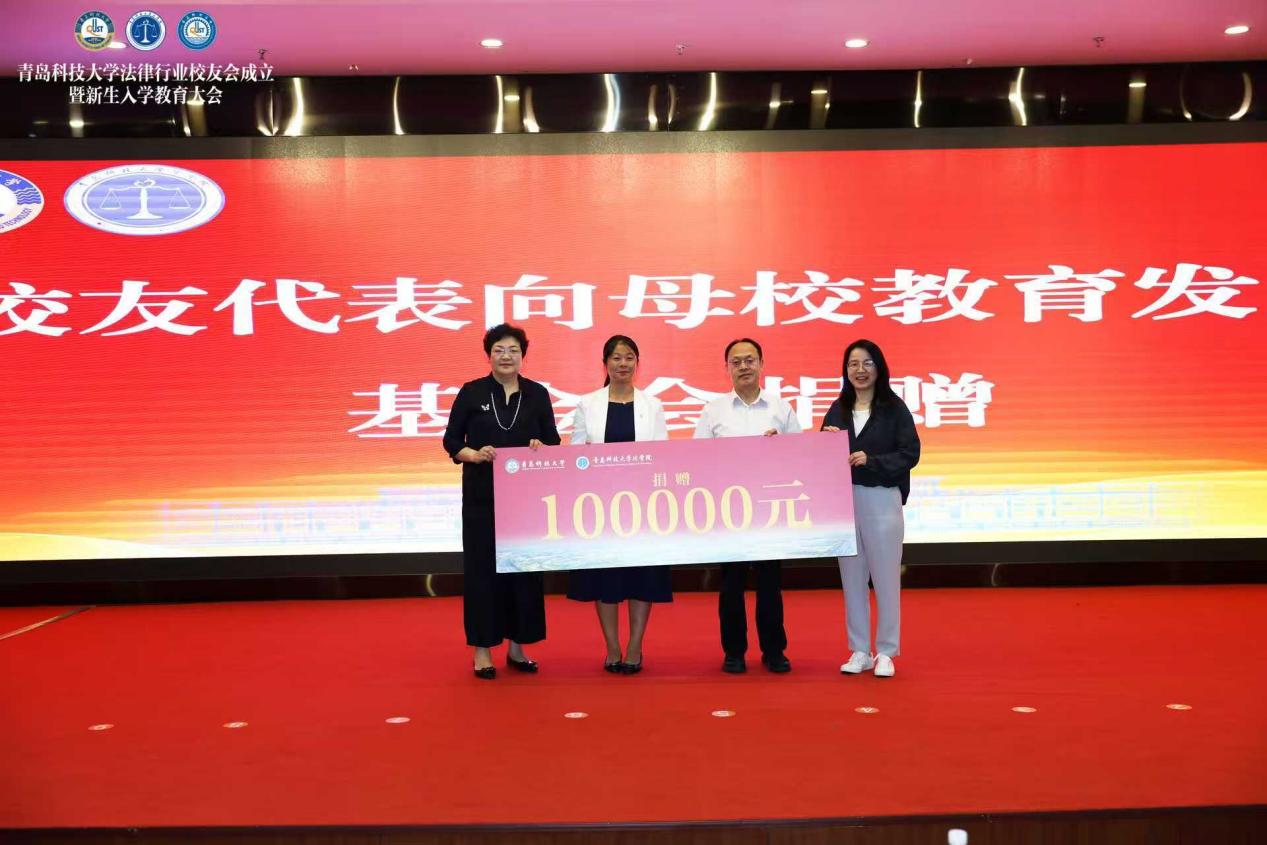 李萍为法律行业校友会授旗,会长王宇、常务副会长张文波上台接受旗帜。为回馈母校、助力法学学科发展,校友代表向母校教育发展基金会捐赠10万元用于学院、学科建设,并向学校、学院分别捐赠书法作品一幅。