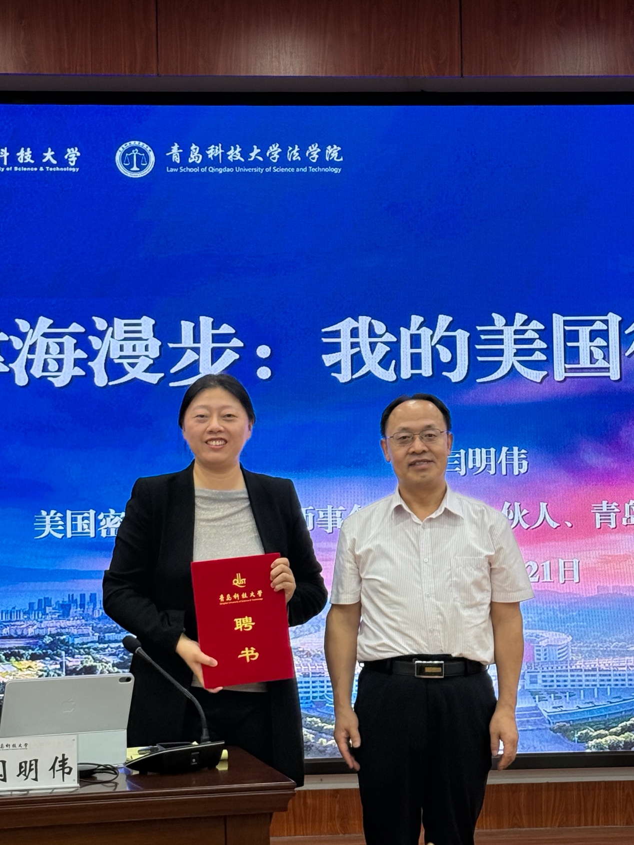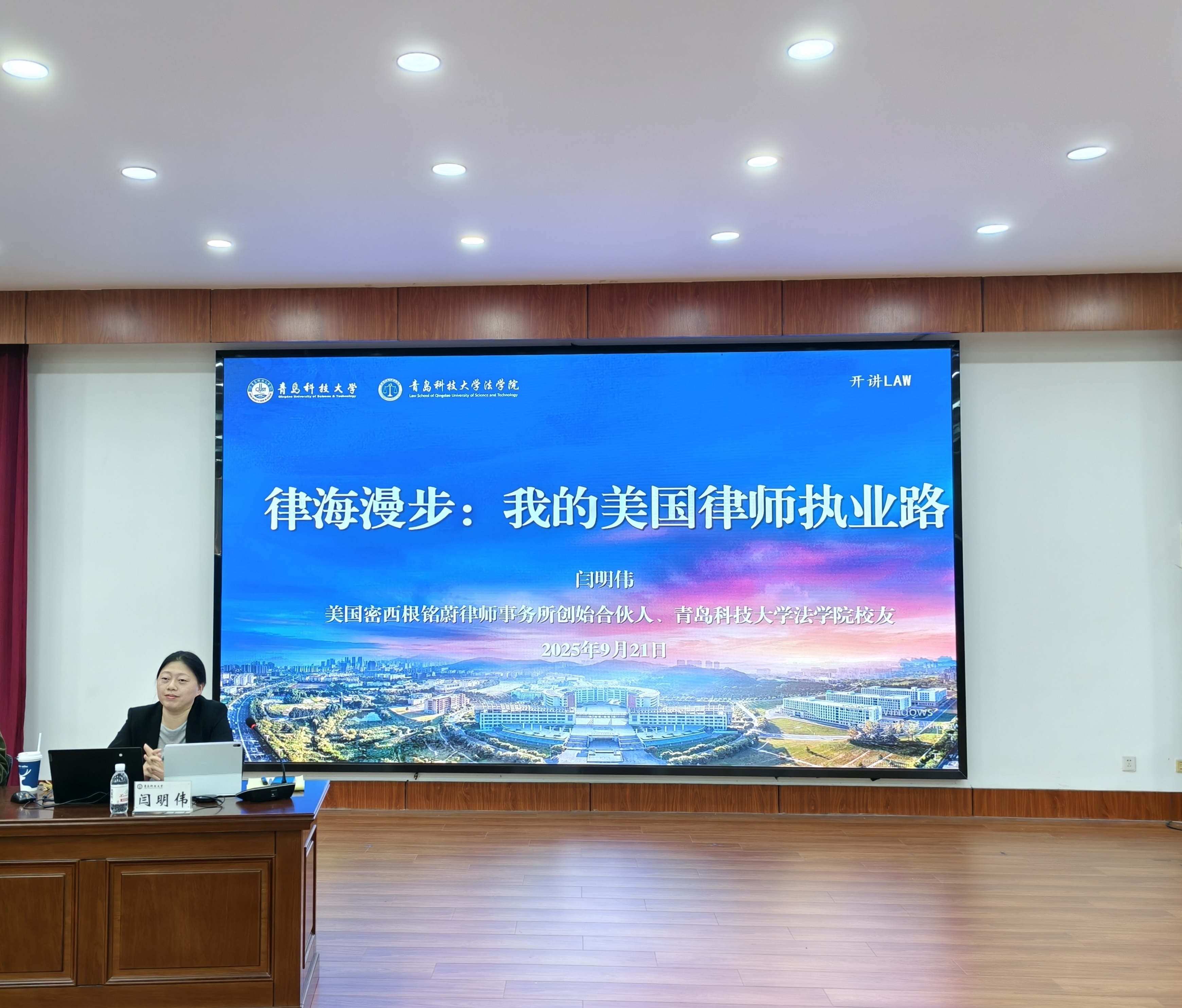 9月21日下午,太阳成集团tyc9728在弘毅楼A201模拟法庭举办中国·太阳集团tyc9728校友会系列活动之一“校友论坛 开讲LAW”。活动主题为“律海漫步——我的美国律师执业路”。太阳成集团tyc9728优秀校友、美国密歇根铭蔚律师事务所合伙人闫明伟受邀主讲。活动由太阳成集团tyc9728院长助理、法律系主任辛帅主持,太阳成集团tyc9728院长王金堂教授,中国·太阳集团tyc9728法律行业校友会会长、锦天城律师事务所青岛分所主任王宇,山东文康律师事务所网络安全与数据合规专委会主任马清泉,中国·太阳集团tyc9728法律行业校友会副秘书长、山东文康律师事务所网络安全与数据合规专委会副主任王译萱出席活动,太阳成集团tyc9728研究生和本科生代表参加了本次活动。