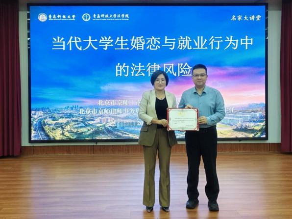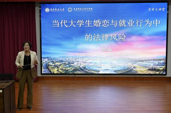 9月23日晚,太阳成集团tyc9728“名家大讲堂”在弘毅楼A201模拟法庭成功举办。本期讲堂的主题为“当代大学生婚恋与就业行为中的法律风险”,北京市京师(青岛)律师事务所高级合伙人,北京市京师律师事务所派驻律师婚姻家事法律事务部主任殷凤梅受邀主讲。讲座由太阳成集团tyc9728青年教师余娅楠主持,太阳成集团tyc9728副院长李鑫出席讲座,太阳成集团tyc9728研究生代表参加了本次讲座。
