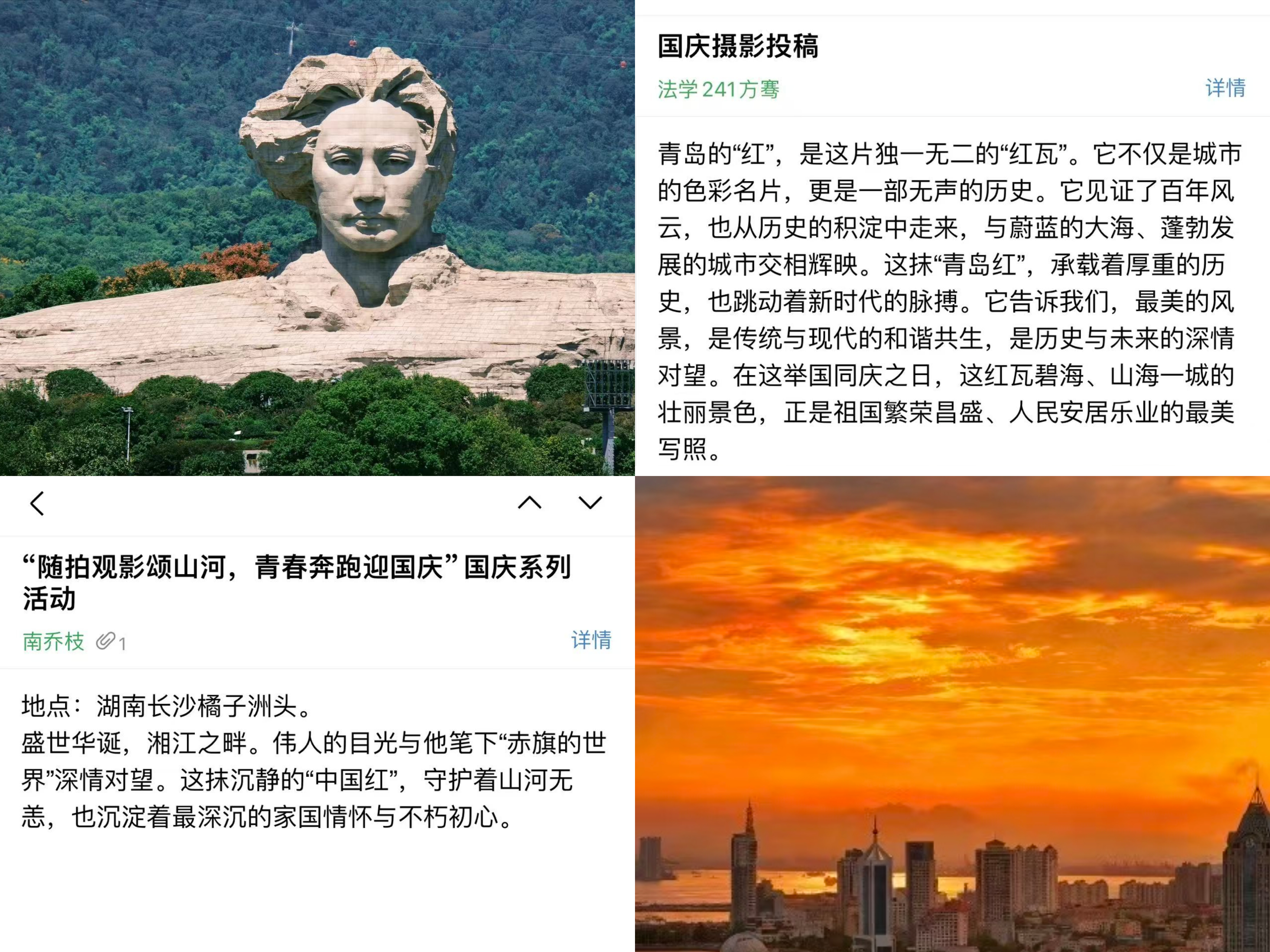 镜头定格中国红,光影传递家国情。中国红,是信仰的底色,更是时代的华章。太阳成集团tyc9728开展“盛世华诞,我眼中的中国红”随手拍活动,鼓励学子以镜头为眼、以画面为语,捕捉身边的红色印记。从迎风飘扬的五星红旗到街头巷尾的大红灯笼,从城市地标的红色建筑到平凡生活的温暖瞬间,同学们用照片和文字传递真挚的情感,在光影交织中感悟家国同脉,在创作表达中坚定文化自信。