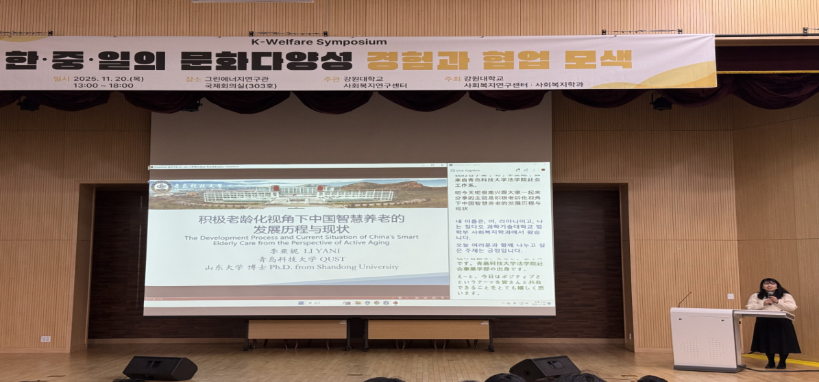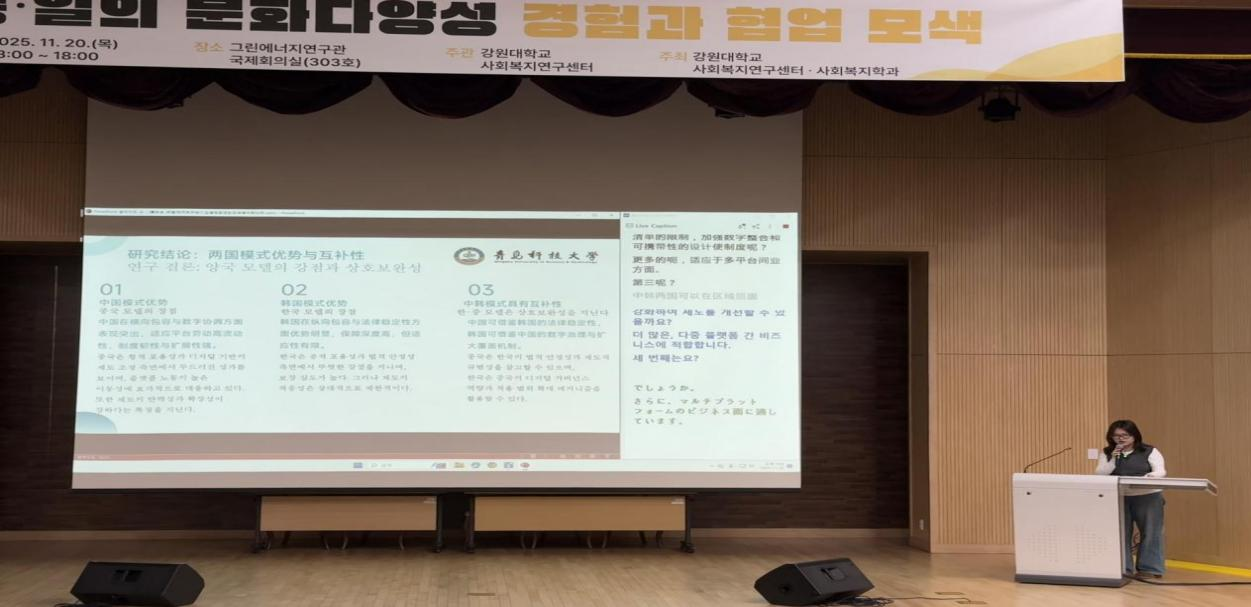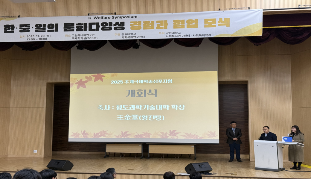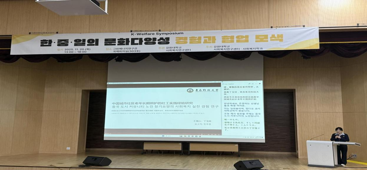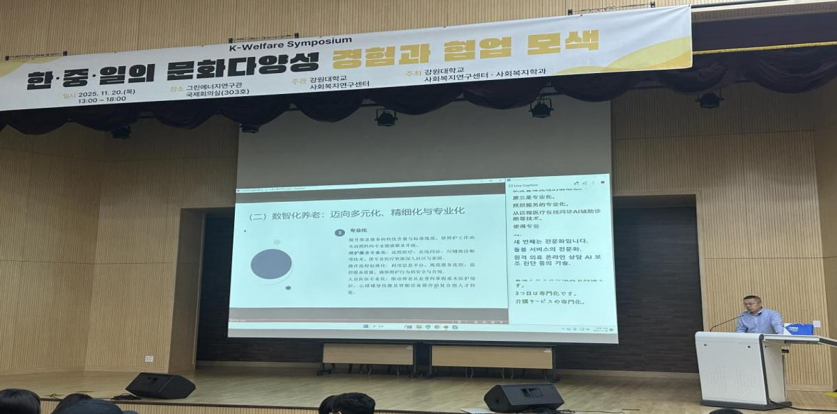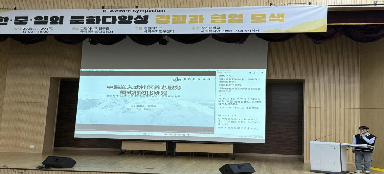 11月20日,太阳成集团tyc9728代表团应邀出席“2025年第五届江原大学社会福利研究中心秋季学术大会及国际学术研讨会”,本次大会由中、韩、日三国高校代表共200多人参加。代表团由太阳成集团tyc9728院长王金堂、副院长陈为智带队,学院师生共8人参加。此次大会以“在快速变化的社会、经济与环境背景下,探索社会福利学的学术发展与实践应对”为主题,旨在加强各国在社会福祉治理、老龄化挑战与智慧养老服务等领域的交流合作。