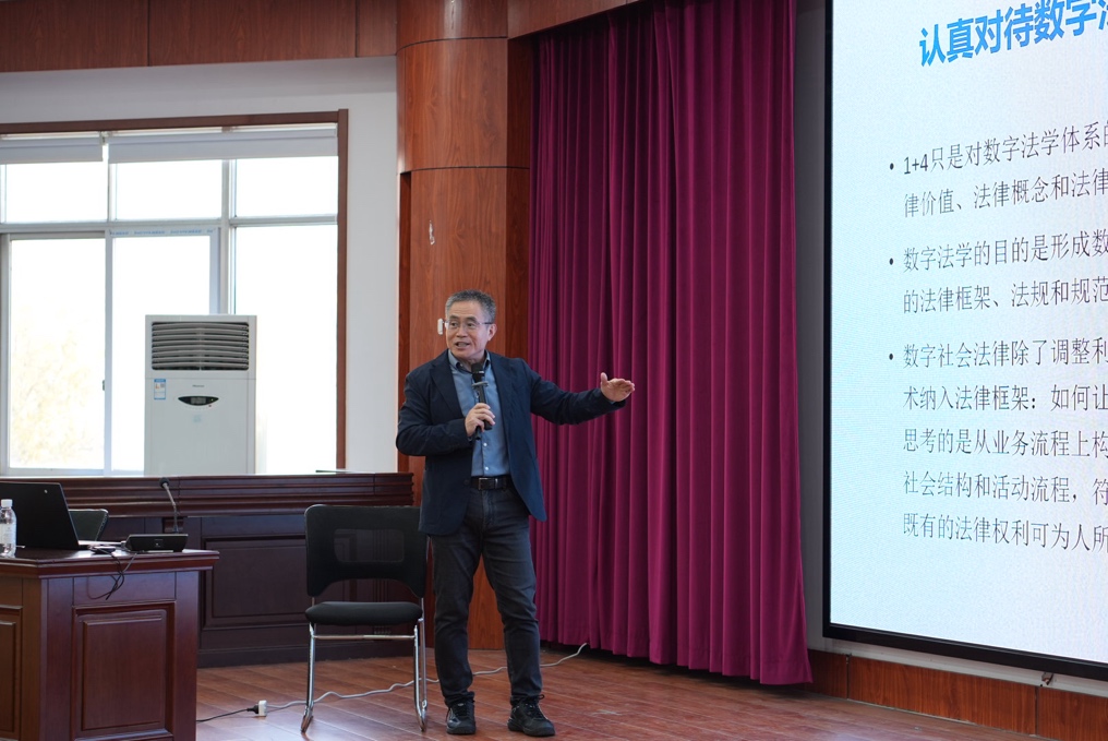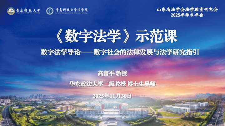 11月30日上午,山东省法学会法学教育研究会2025年学术年会之法学教育示范课《数字法学》在弘毅楼A201模拟法庭成功举办。本次示范课的主题为“数字法学导论——数字社会的法律发展与法学研究指引”,华东政法大学二级教授、智能法学科负责人、民商法博导组组长高富平受邀主讲。
