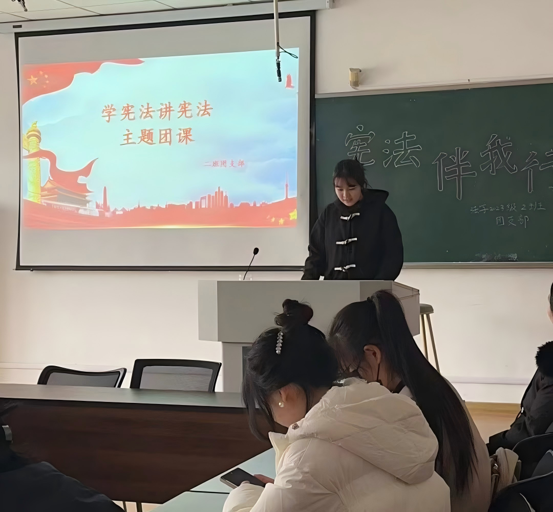 团支部书记孙之茹从习近平法治思想的内涵要义出发,系统讲解宪法的根本地位、核心条款,以及宪法与法学专业学习、公民日常权益的紧密联系。