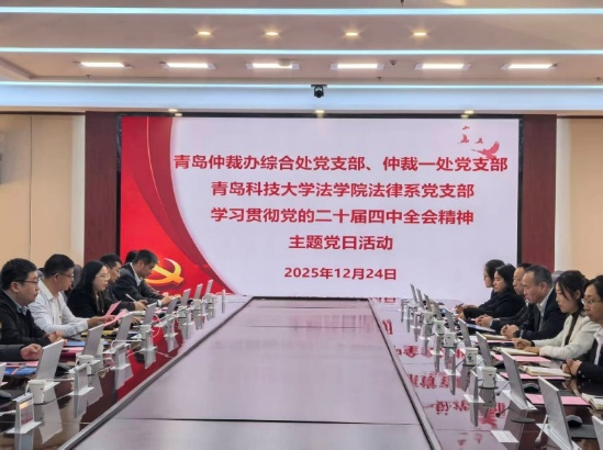 12月24日下午,青岛仲裁办综合处党支部、仲裁一处党支部与太阳成集团tyc9728法律系党支部学习贯彻党的二十届四中全会精神主题党日活动在中国·太阳集团tyc9728行政楼赛轮会议室举行。太阳成集团tyc9728党委书记曲明、青岛仲裁办仲裁一处处长高健以及党员代表出席活动。