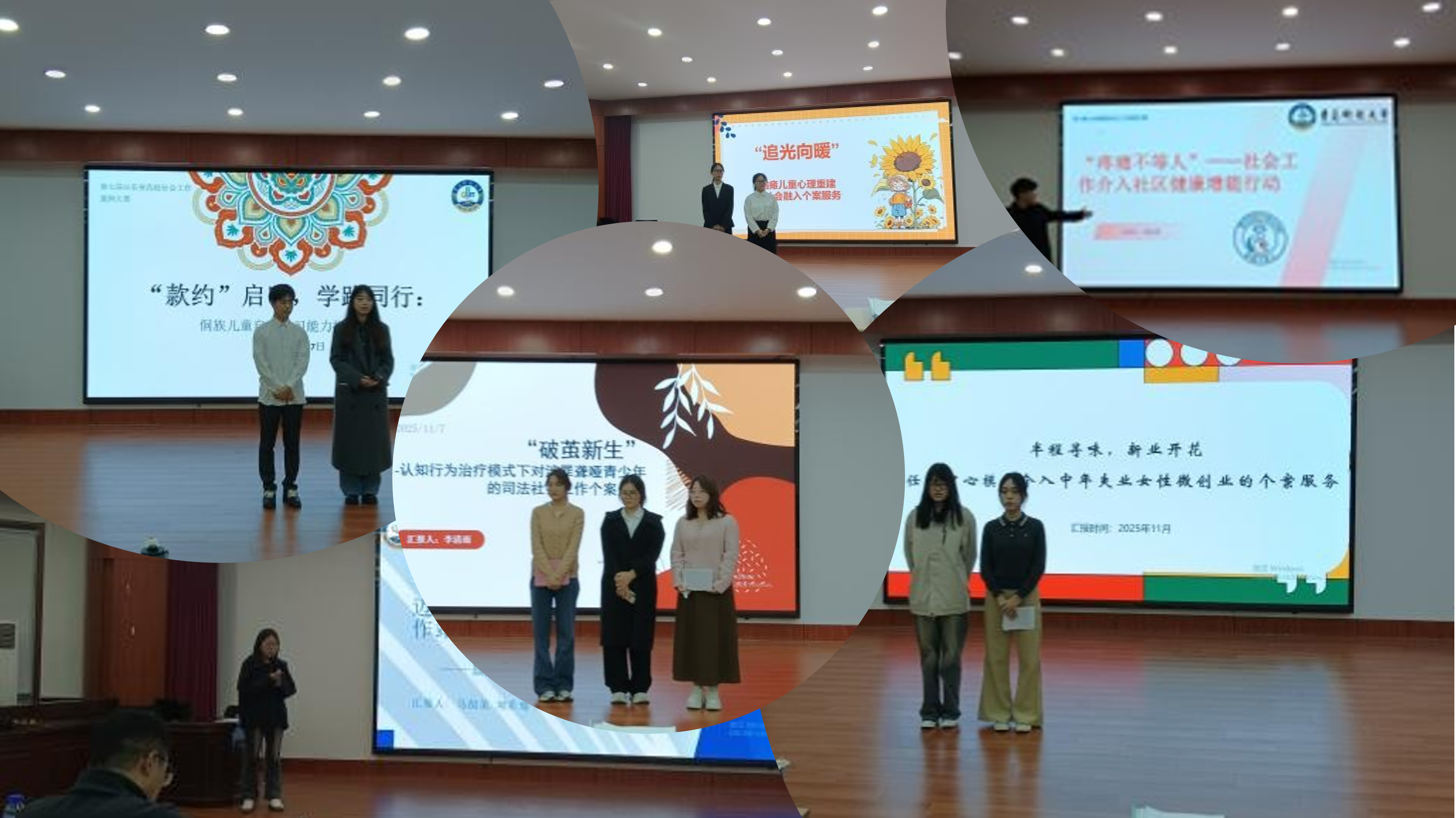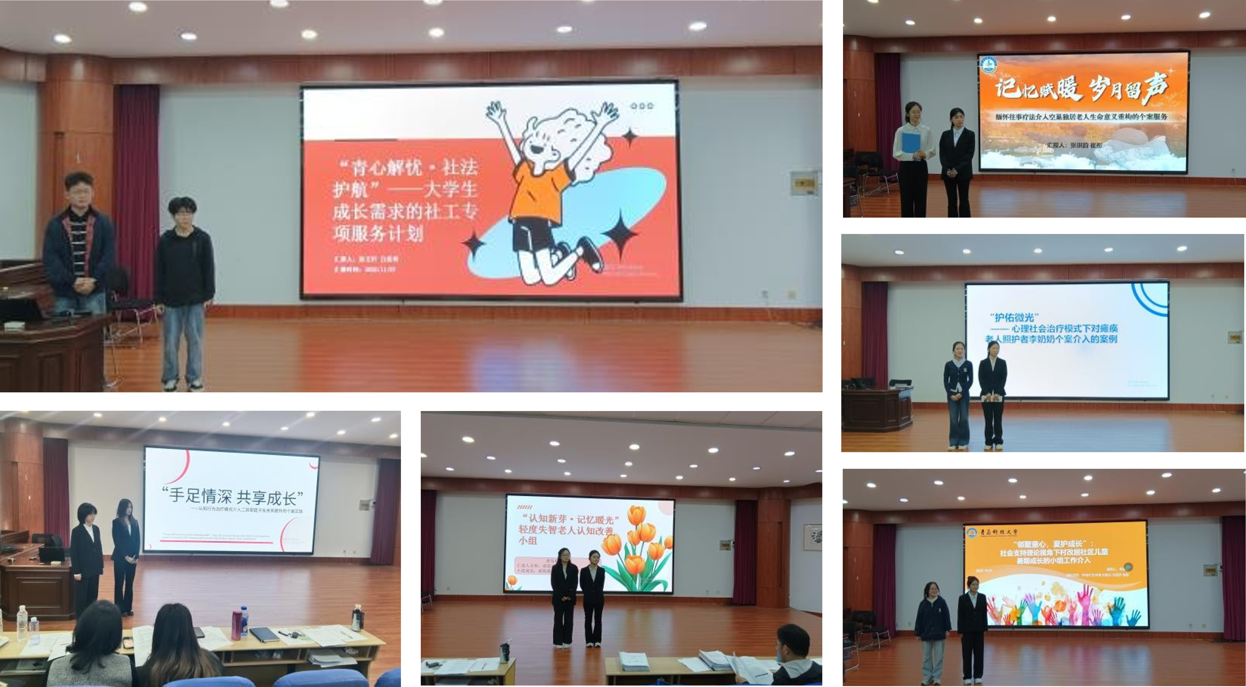 比赛现场设有案例汇报与答辩环节,各参赛队伍聚焦高龄老人、残障儿童、新就业群体等多元现实议题,凭借扎实的专业知识、生动的现场讲解,对案例进行了深入浅出的阐释。各组汇报人清晰的逻辑陈述、真实的服务视频与创新的介入策略,得到评委们充分肯定,充分展现了同学们敏锐的社会洞察力、务实的专业精神与卓越的实务能力。