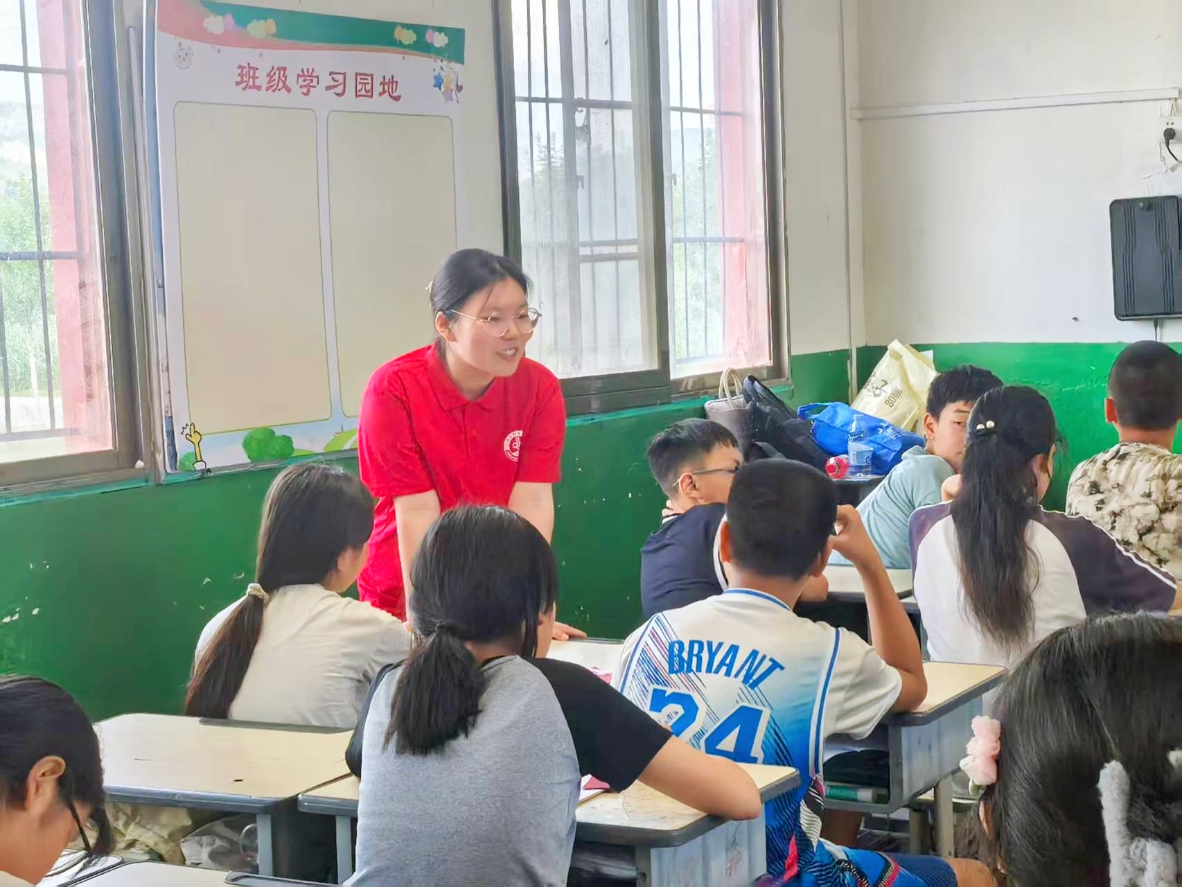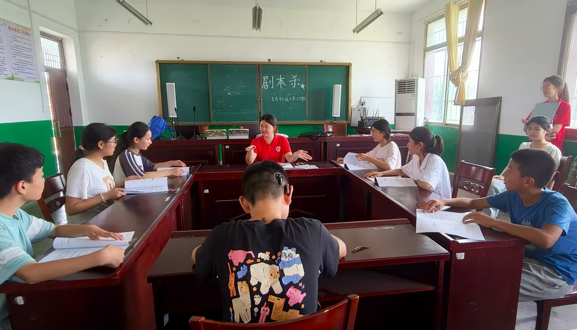 团队成员富有创新性地开展了“铭记历史,珍爱和平”的主题实践活动。伴随着《歌唱祖国》的嘹亮歌声,团队成员与西集镇中心小学的孩子们进行了破冰活动,迅速拉近了和孩子们之间的距离。随后,团队成员以“红色故事会”和“爱国诗词朗诵”为载体,带领孩子们重温铁道游击队等经典故事,在声情并茂的演绎中传递革命精神。特别设计的“抗战剧本杀”环节,则让孩子们通过角色扮演,在解密与协作中体悟抗战时期的智慧与勇气,在潜移默化中传承红色基因。