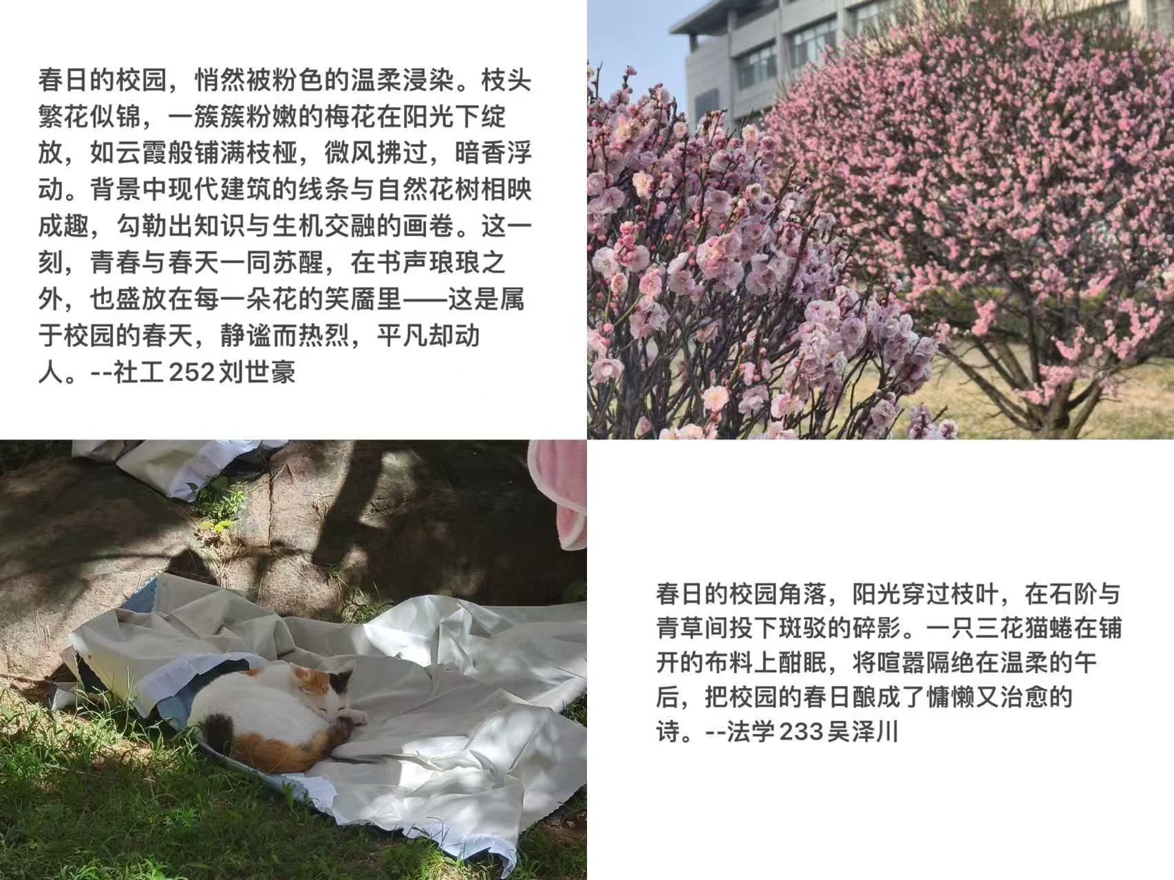 在“春日随手拍·发现身边美”线上摄影征集活动中,同学们走出宿舍、走近生活,用镜头捕捉校园内外的春日美好。一朵绽放的鲜花、一片嫩绿的新叶、一道温暖的阳光,都成为镜头下的动人景致。同学们提交摄影作品,分享画面背后带来的积极感受与温暖力量,在发现美好、记录美好中汲取生活的正能量。